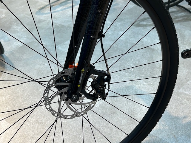 ブレーキはディスクブレーキを採用。天候に左右されにくく、峠の下りや未舗装路でもブレーキコントロールがし易いです。