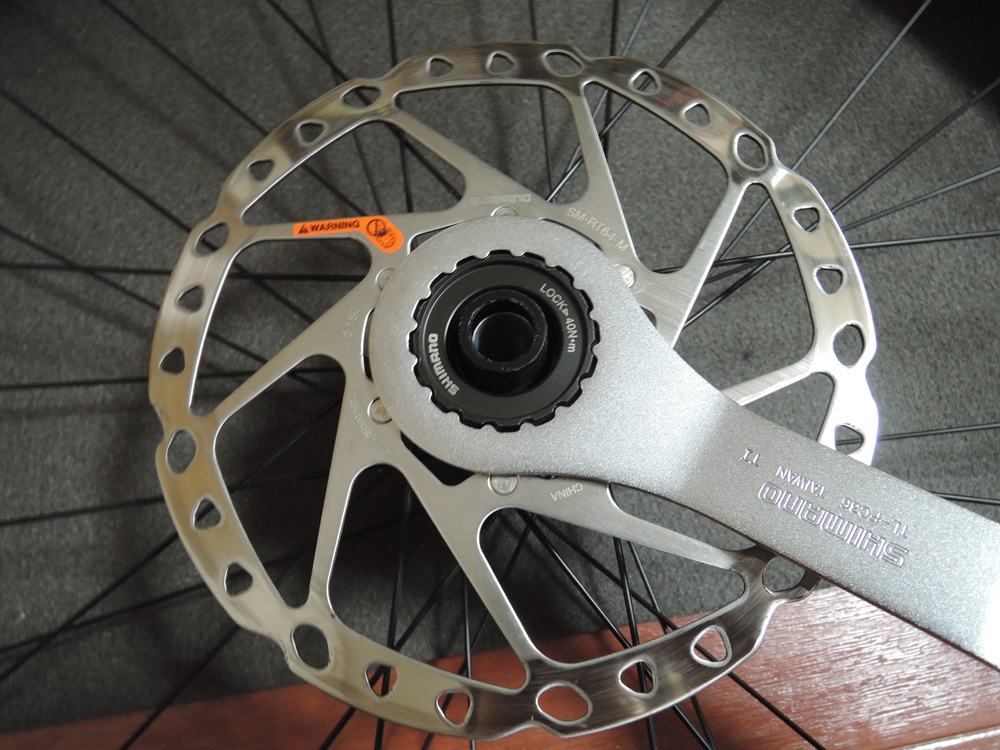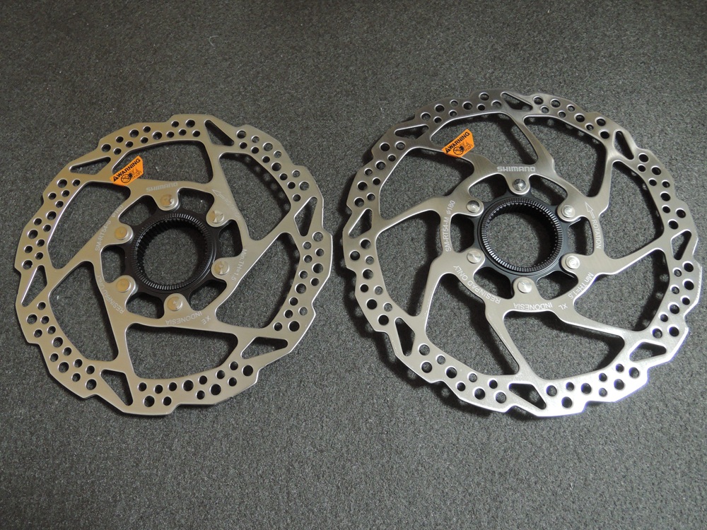 ブレーキキャリパーBR-MT500に推奨のセンターロックタイプローター。サイズは純正と同じくフロント180mm、リア160mmとしました。MTB用なのでロックリングは外セレーションです。