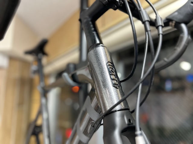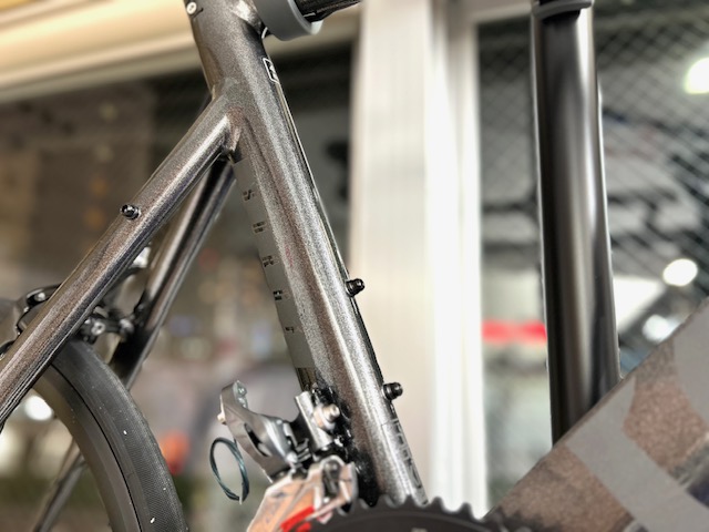 画像のノイジーシルバーは、ラメ感の強いシルバーで、エアロ形状のダウンチューブの美しさをより一層際立たせる高級感溢れるカラーです。