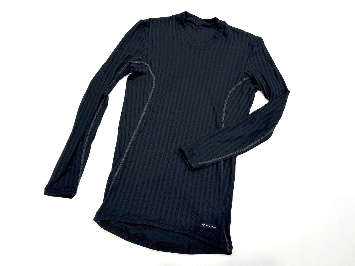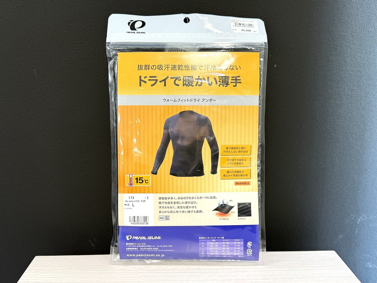 国内のサイクルウェアブランド筆頭、パールイズミの15℃帯薄手長袖アンダーウェア。価格も比較的手頃でサイズ感もわかりやすいので、まずはここからという方も多いですね。