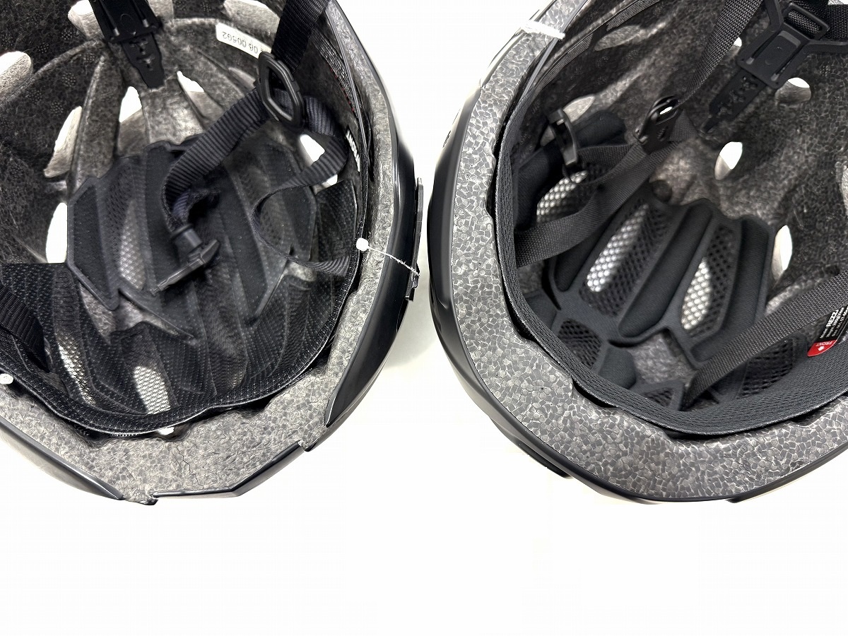 REZZA-2(写真左)とREZZA-3(写真右)を並べてみると、ヘルメットの前方部分からサイド部分にかけて、衝撃吸収ライナー(発泡スチロール)の厚みが増しているのがおわかりいただけるかと思います。従来モデルでも強度および安全性は十分にありましたが、より強化された形になります!その分少し重量がUPしてしまっているのですが、強度・安全性の向上は万一の時のことを考えると頼れる変更点ですね。