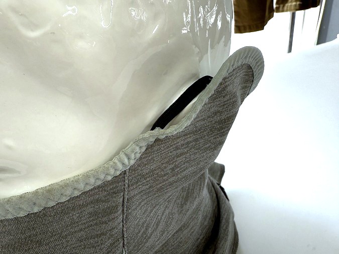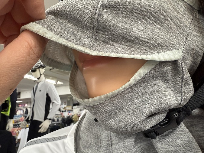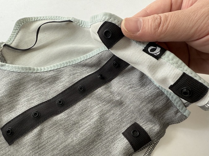 サイズはフリーサイズですが、後ろ側がスナップボタンで調整できるようになっています。後ろが全開するので、サイクルキャップやヘルメットをかぶったままでも着脱できるのが特徴。