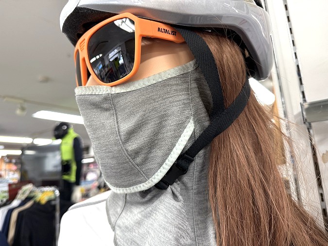 アイウェアと一緒につけて、顔周りの日焼け対策はバッチリ!頬のあたりが少し露出するので日焼け止めを塗っておくとなお安心です。