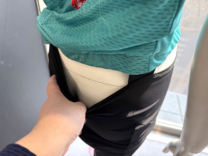 こちらのビブショーツ、上に着こんだジャージをいちいち脱いでビブストラップを外さなくてもトイレ休憩が可能なんです!
