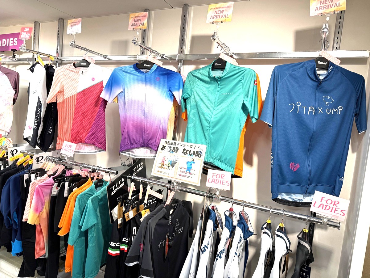 まだごく一部のみではありますが、2025年春夏レディースアイテムも徐々に入荷中!!夏らしい華やかかつ爽やかなカラーのジャージなどが入ってきていて注目ですよ~!!店頭では今回ご紹介したビブショーツをはじめジャージやロングタイツも試着していただけますので、是非色々合わせてみてくださいね!!
