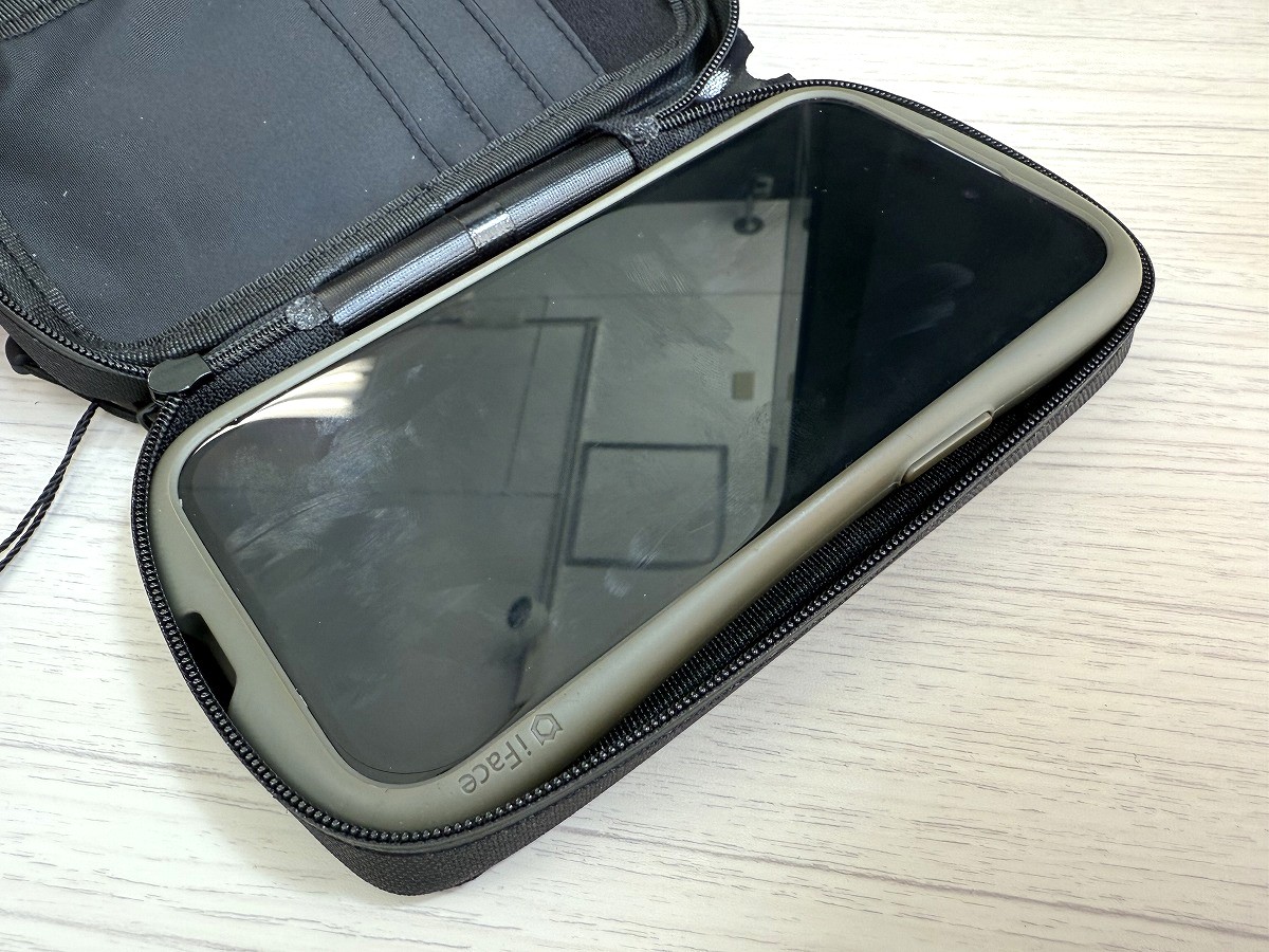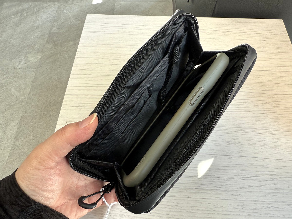 コンパクトなサイズ感なので、スタッフのiPhone15はケース付きだとちょっとギチギチ感が出ますね;ケース無しだったり小さめサイズのスマホだともう少し余裕があります。