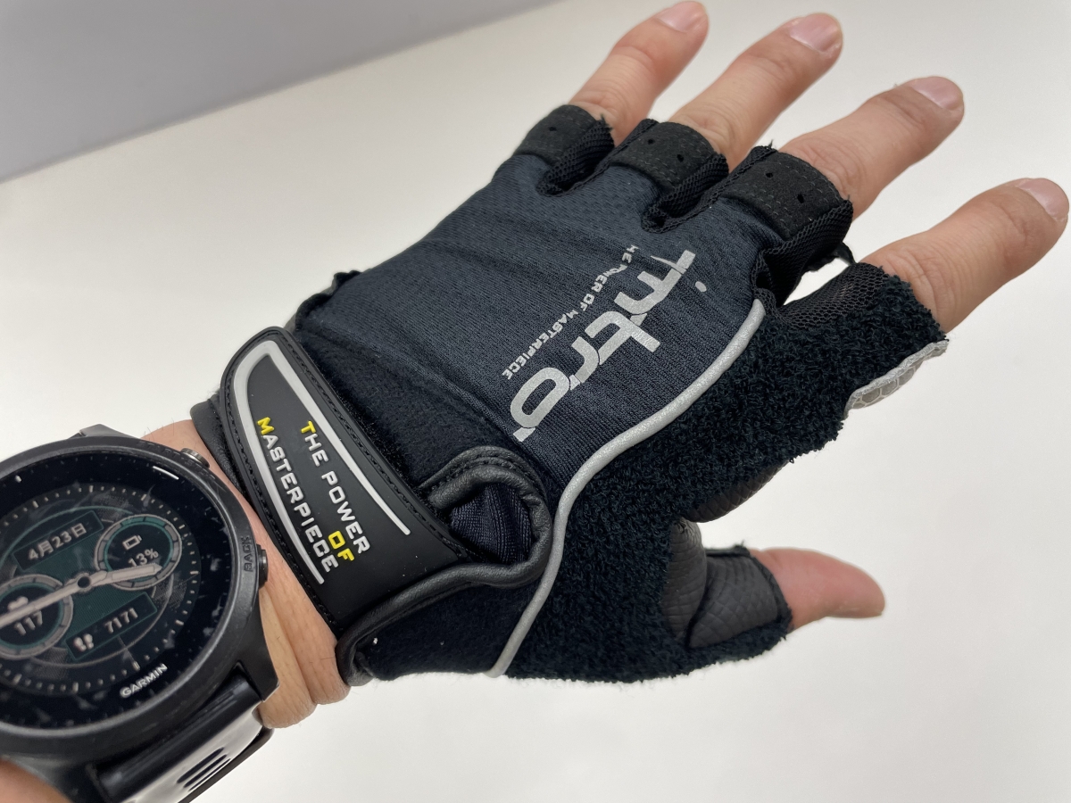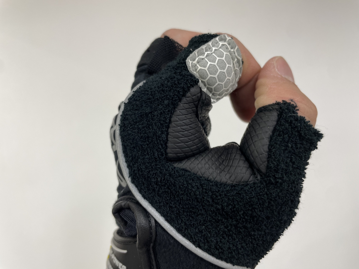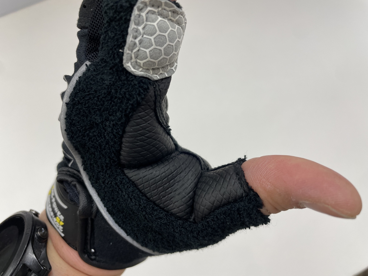 手のひらはもちろんしっかりパットが入っていますが、ハンドルを握る際に当たる親指と人差し指の間もしっかりパットが入っています。