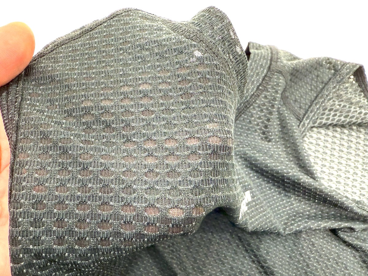 熱伝導率が低い=体温を奪われにくい性質なので、先述の冬用アンダーウェアとの重ね着にもおすすめです。繊維自体が保水せず、通気性もあるため汗をかいていても肌はドライな状態に保たれます。肌当たりが気になりやすいポリプロピレン100%、さらにこの網目の大きさなので肌の弱い方は少し気になるかもしれませんが、とてもそうとは思えない肌触りの柔らかさとなっています!