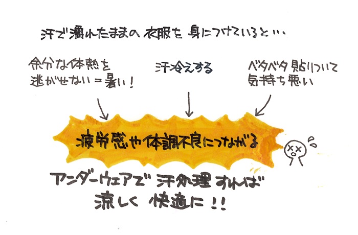 アンダーウェア着てるよ!という方も、お話を伺っていると逆効果・効果減になってしまっているケースがちらほら。汗を”適切に処理できるかどうか”が重要であり、アンダーウェアなら何でもいいというわけではないのがポイントです。
