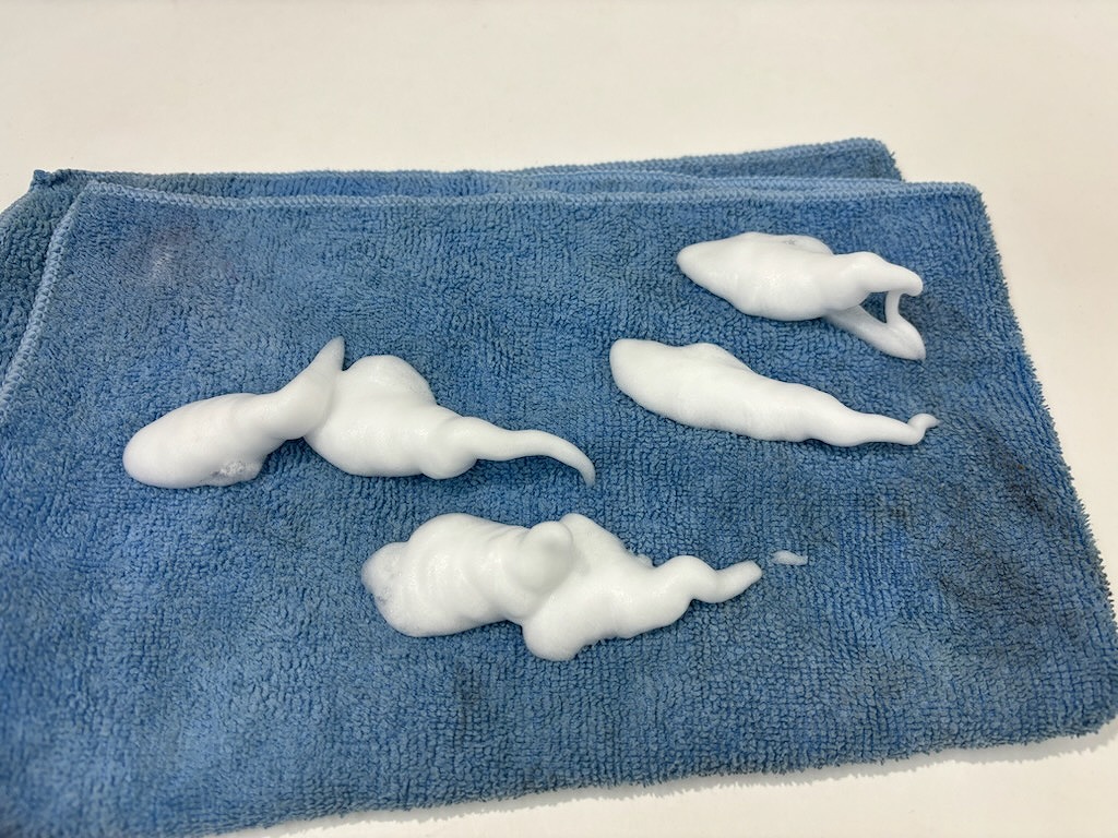 泡が表面に残っているうちに吸水性の高いクロスで拭き取ります。