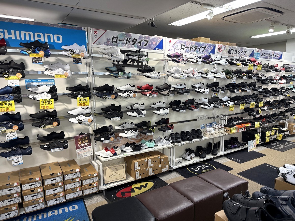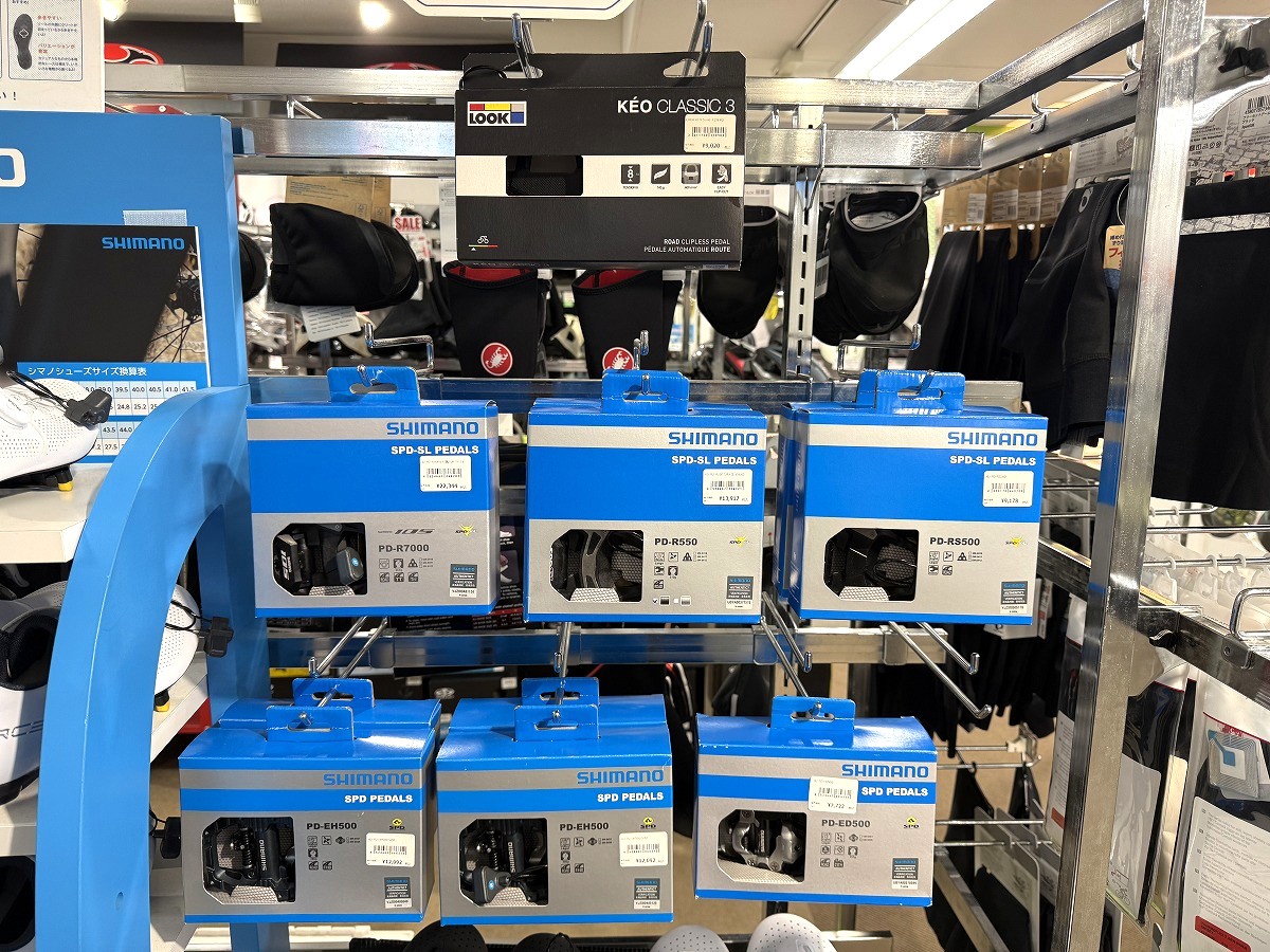 ペダルはシマノ製の初心者さん向けモデルを中心に定番の人気アイテムをウェア館でも取り扱っておりますので、シューズと一緒にご覧いただけます♪自身のスタイルに合ったペダル&シューズ探しのお手伝いをさせていただきますので、お気軽にスタッフにお声がけくださいね。