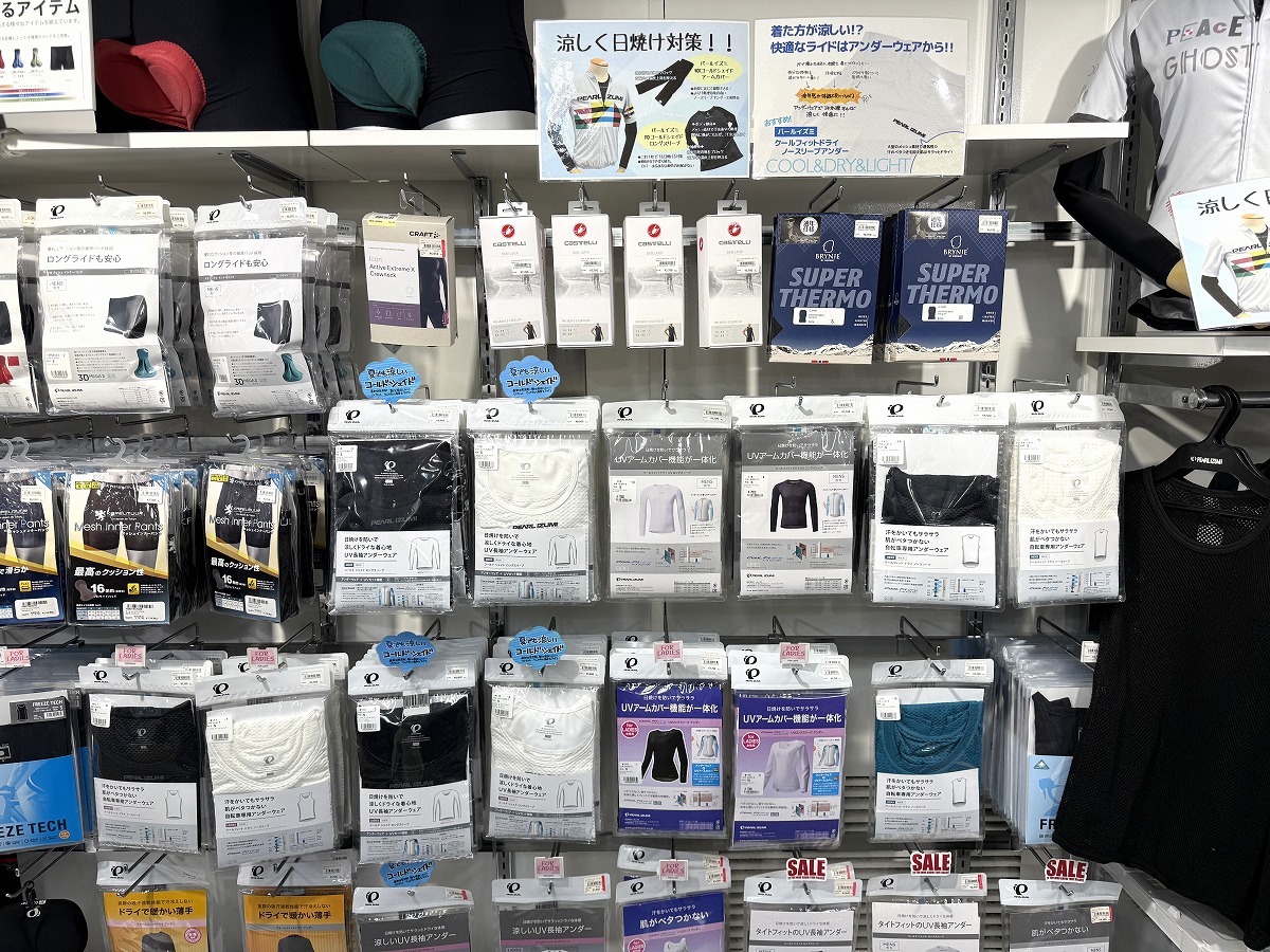 コーディネートの基盤を支えるアンダーウェア、今回ご紹介したカステリ以外にも定番かつ比較的お手頃なパールイズミ、汗処理性能No.1のBRYNJE、手っ取り早く身体を冷やしたい方向けのFREEZE TECHなど取り揃えております!日焼け対策を同時に賄える長袖アンダーも人気。是非アンダーウェアを取り入れて快適なライドを楽しんでくださいね!