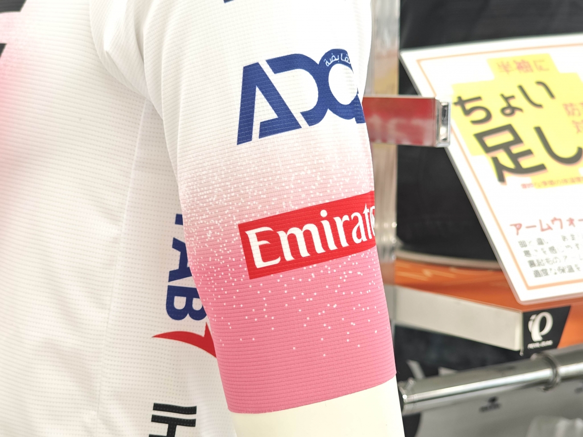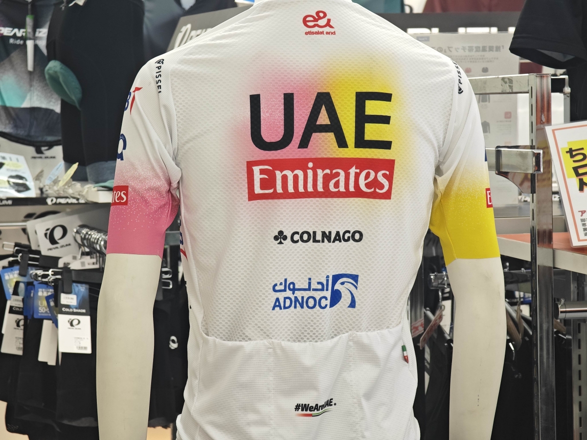 白をベースとしたUAEロゴジャージにツールドフランス・ジロデイタリアのイメージカラーのイエローとピンクが差し色として使われています。