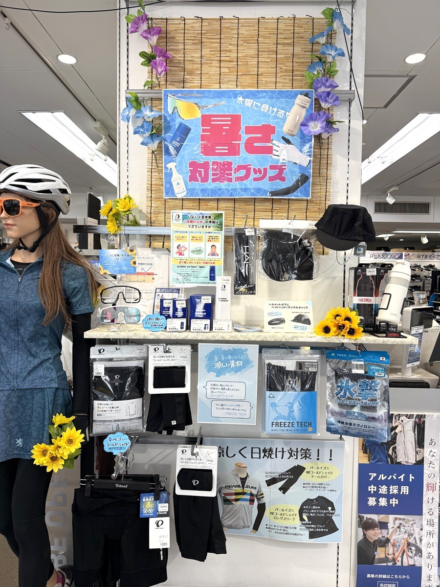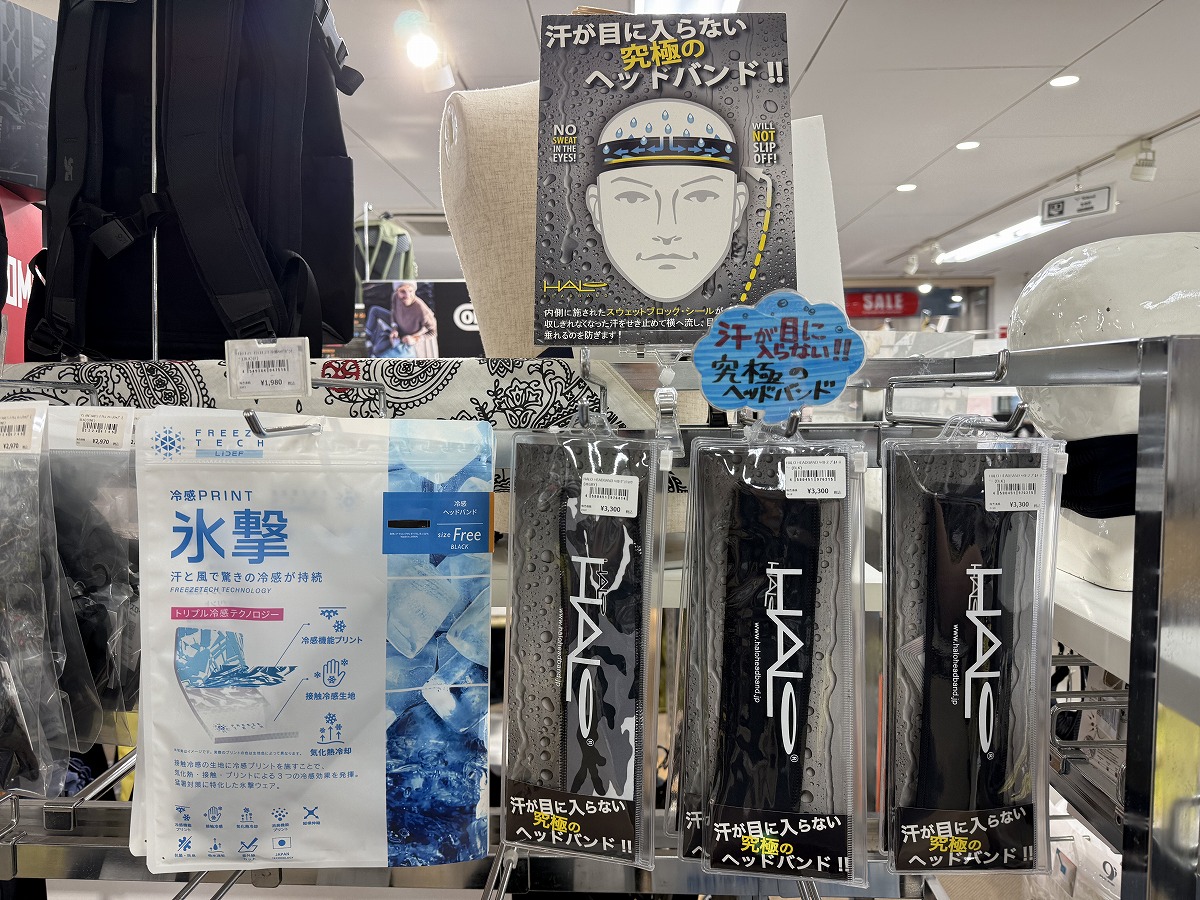 レジ横で展開中の暑さ対策・UV対策におすすめのアイテムを集めた特設コーナーでもHALOヘッドバンドをご紹介していますので、是非他の暑さ対策アイテムと併せてご覧くださいませ!