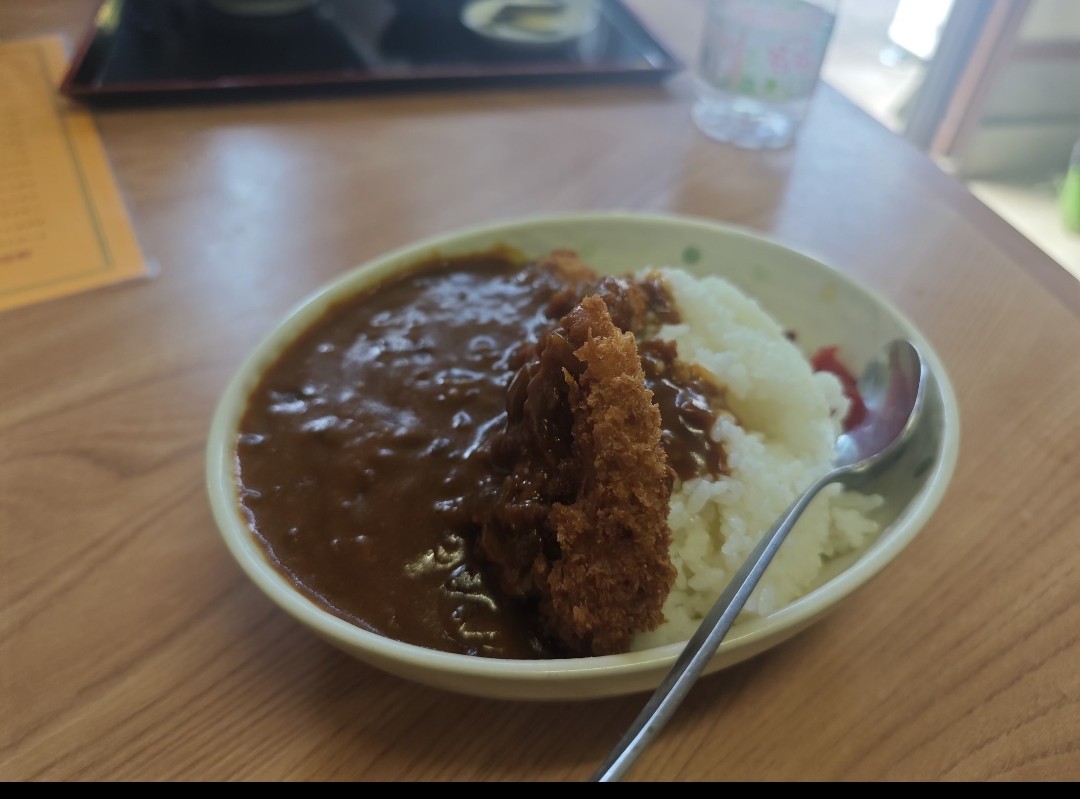 唯一開いていた食堂でカツカレーを補給、僻地ですが価格はリーズナブルで感謝、おばあちゃんから鹿とクマが出ると注意を受けました。