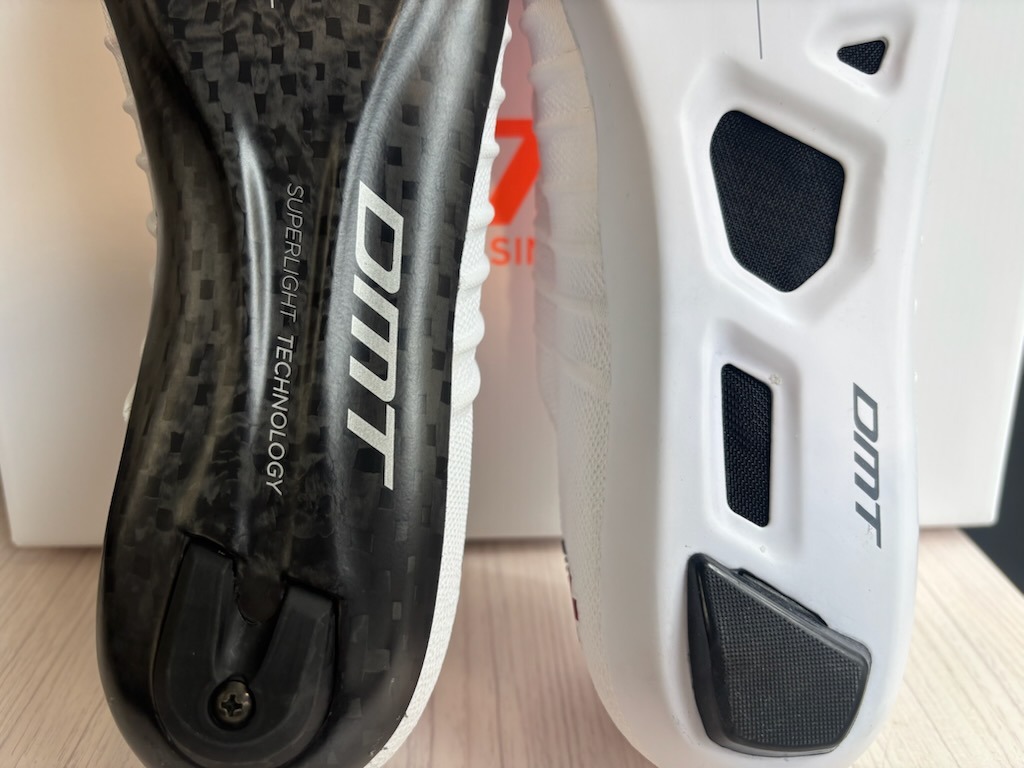 (左が新作、右が前作)お次はアウトソール。見ただけで分かりますね。新しくなった超軽量カーボンソール。ベンチレーションは少ないですが元々ニットアッパーなのでそこまで心配する必要が無いということなんでしょうか。クリートの調整幅が広がっていますね。アウトソールが白じゃなくなったのが残念なのとLOOKのクリートメモリ機能が無くなりましたが軽量化のために致し方が無し。ヒールパッドがねじ止め式で交換可能なのは嬉しいですね。フィッティングの面を見てみると