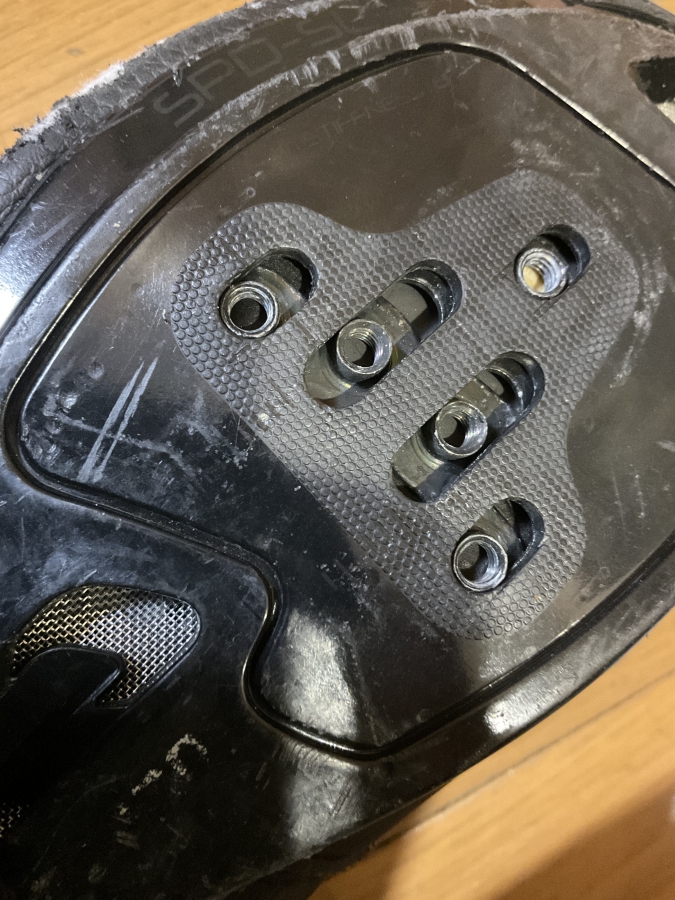 変換キットを使えば段差を作ることができ、3つ穴しかないシューズでもSPDをつけることができたり、クリートやソールも保護できます。また、多少歩きやすくもなります。