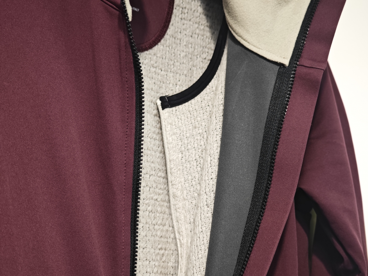 外側のPolartec® AirCoreが風や雨を防ぎながらも高い通気性を発揮し、内側のPolartec® Alphaが保温と汗処理を行います。