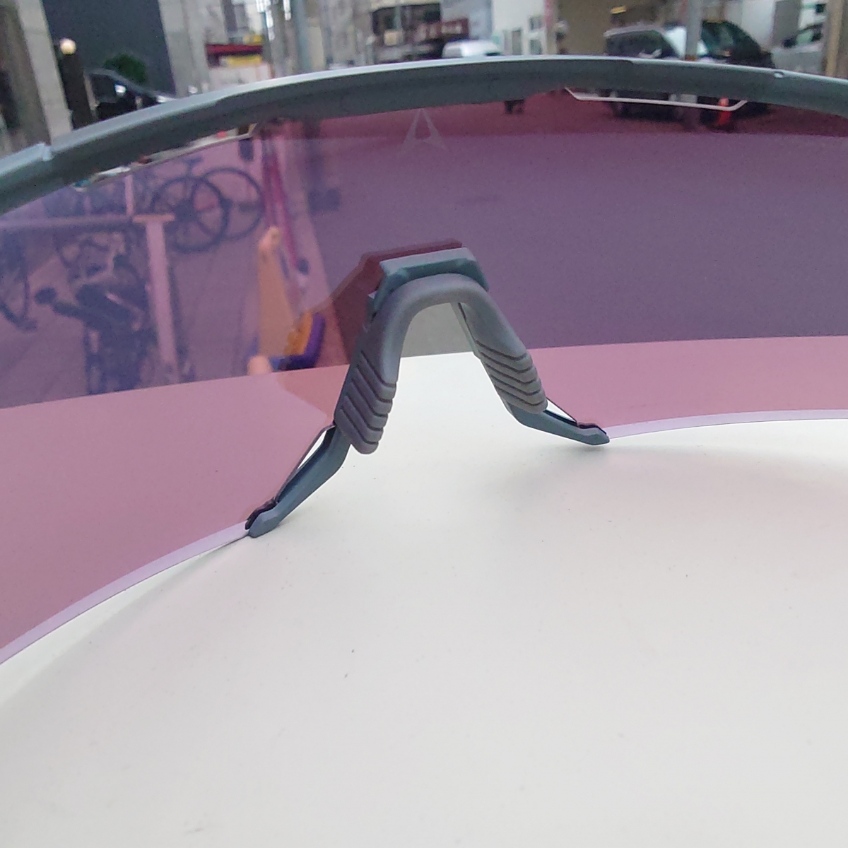ノーズパッドは初期からついているMサイズとSサイズが付属しテンプルのホールド感は高めで激しいオフロード競技でもズレが少ないです