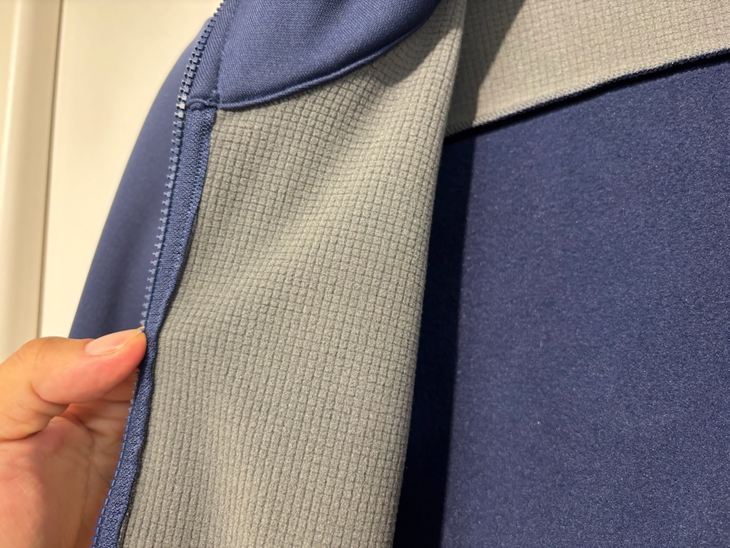 前身頃の裏地はマイクログリッド構造で保温性に優れています。