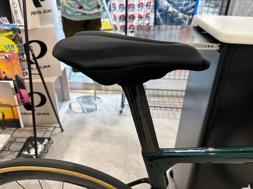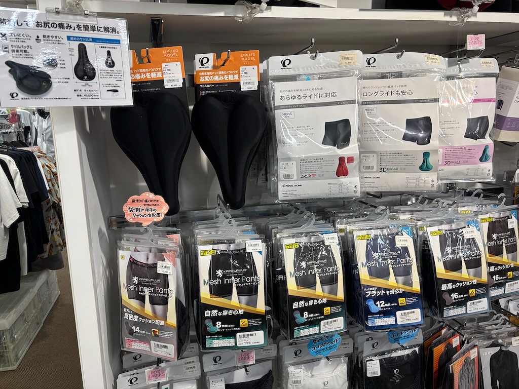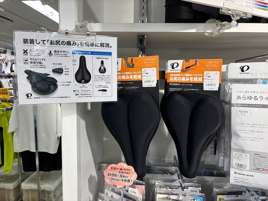 自身が乗る自転車のサドルに着けれるのかなぁという方はスタッフにお声掛けいただければ着けれるか試すことができるのでお気軽にお声掛けください。サドルカバーはインナーパンツコーナーにございます!