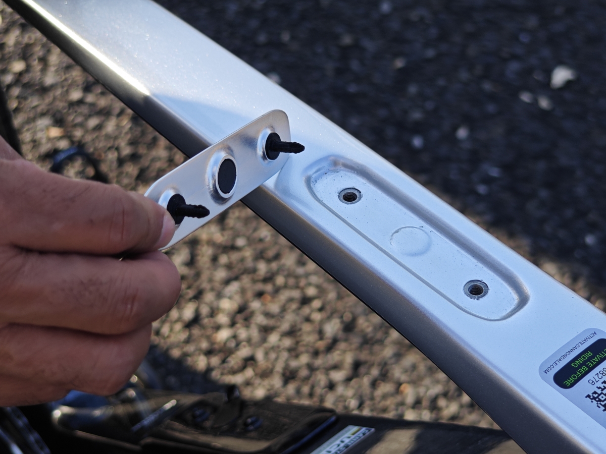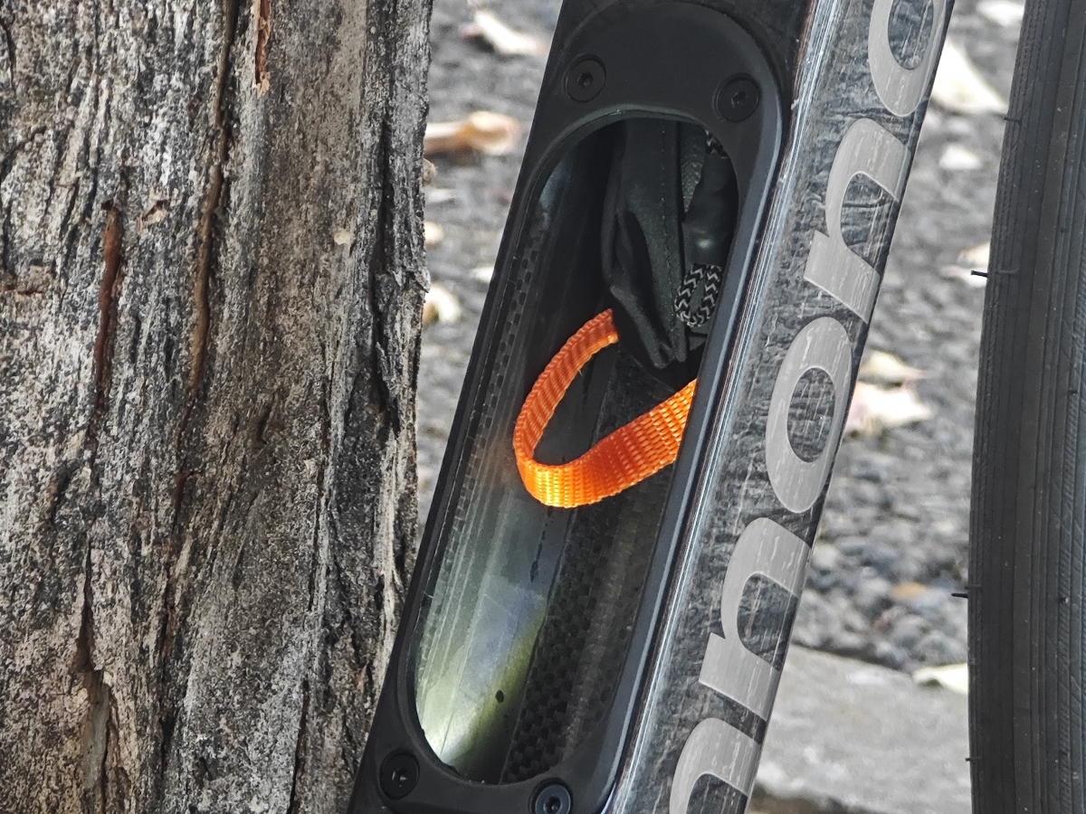 トップチューブも蓋を取るとダボ穴がありトップチューブバッグを取り付けることができる、ベルトだけでも固定は可能だが擦れ傷が入ってしまうためこの方式の方がバイクにやさしくなっています。