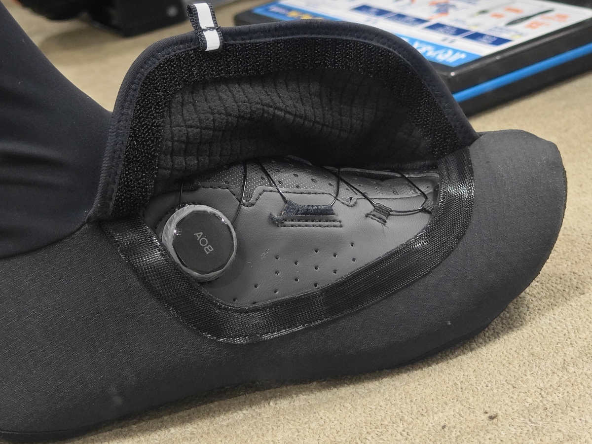 通常であればシューズカバーの上からめちゃくちゃ頑張って締めないといけないのですがこちらのシューズカバーでは簡単に締められます。