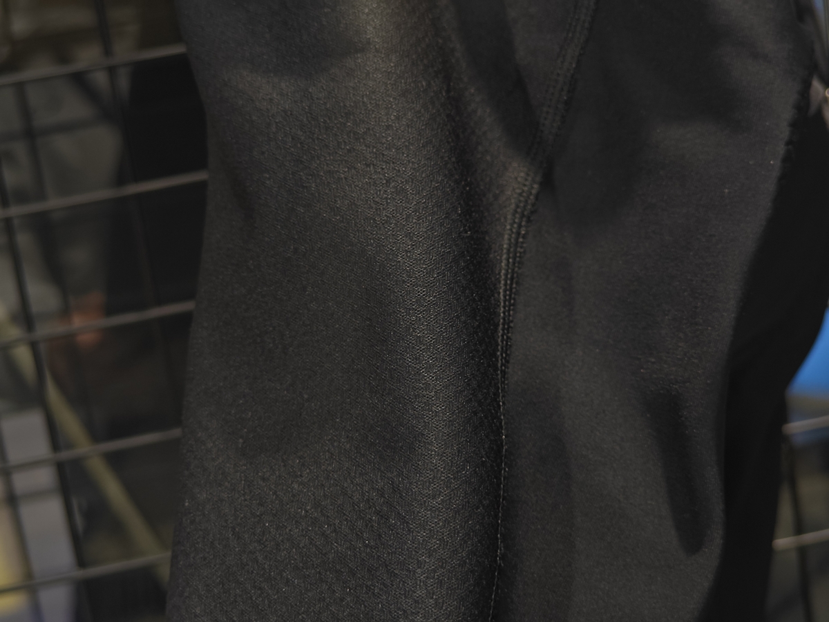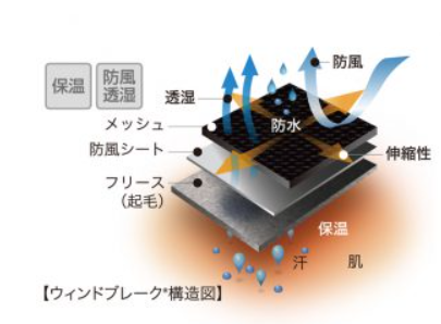風が当たる前面には優秀なウィンドブレークを使用し後ろ側とは生地を使い分けています。