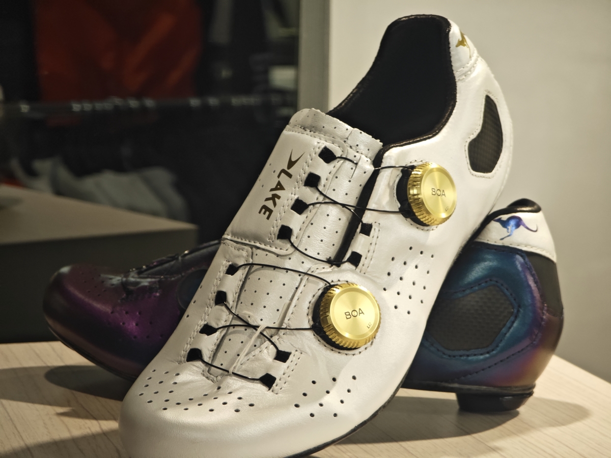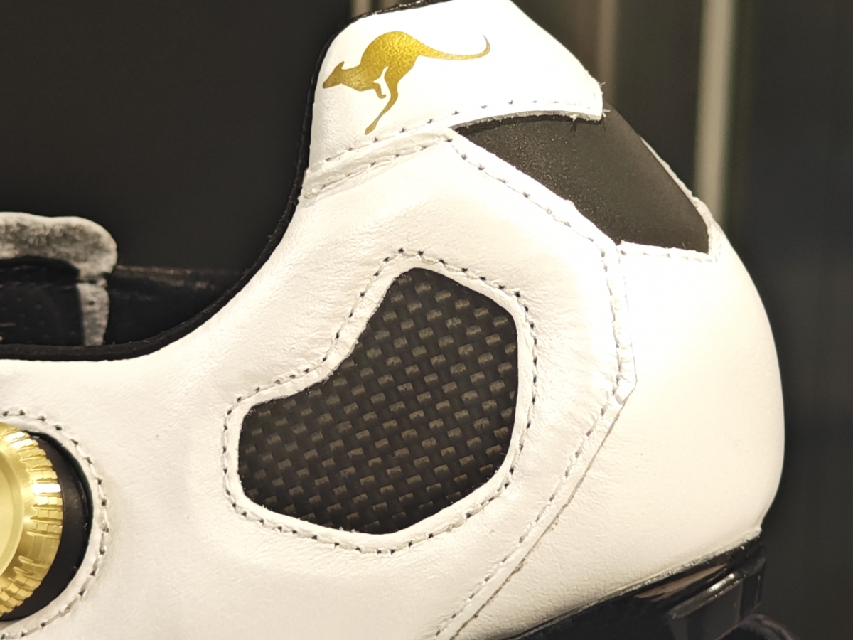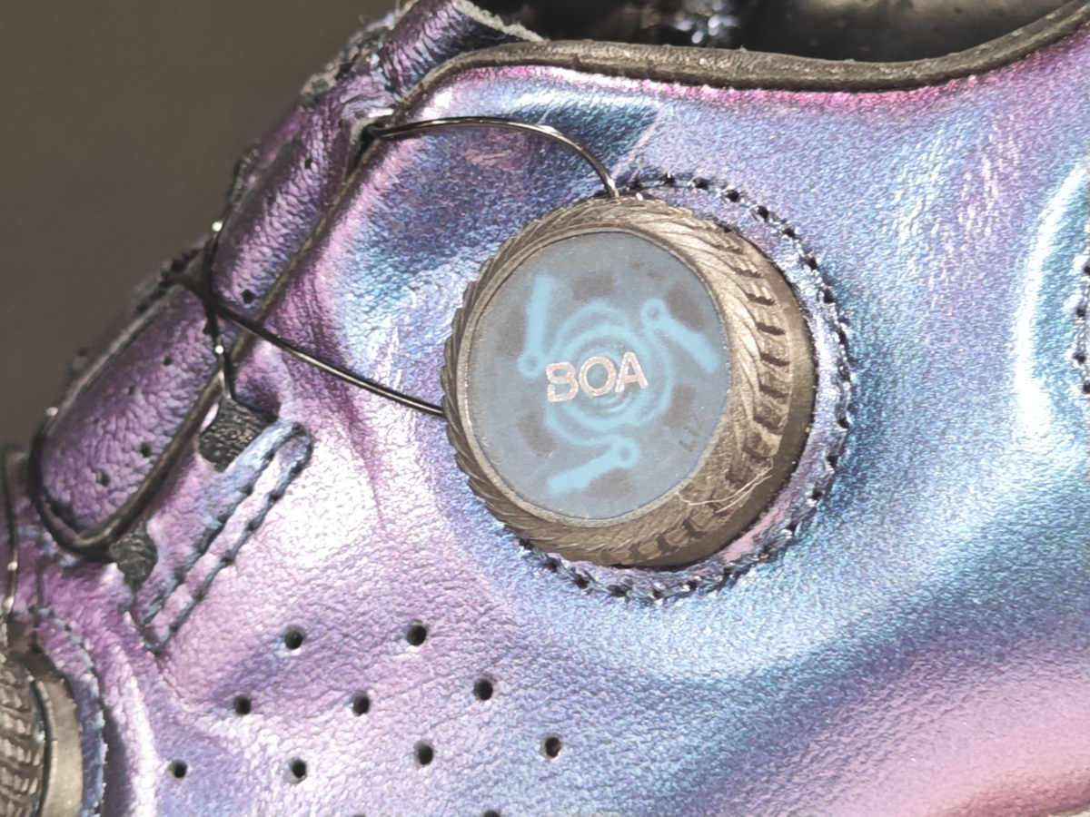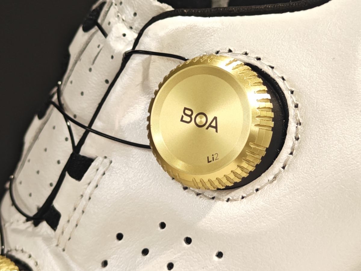 パールの入ったホワイトのアッパーにGOLDカラーのアルミ製BOAは相性が良いですね、通常は樹脂なので高級感がまるで違います。
