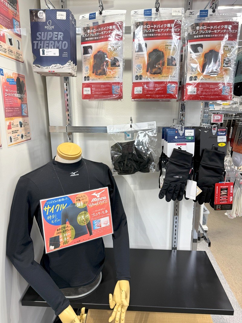 これから先の厳寒期を乗り切る防寒アイテムなら、スポーツメーカー「ミズノ」とスポーツサイクル専門店「ワイズロード」が共同企画した、Y’s Roadオリジナル『ブレスサーモ』シリーズがおすすめ!!特にアンダーウェアは先述のとおり重ね着の基礎部分にあたるため、防寒ウェアを揃えるなら是非持っていたい1枚です。