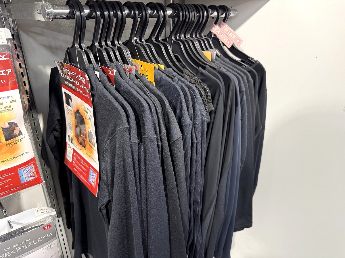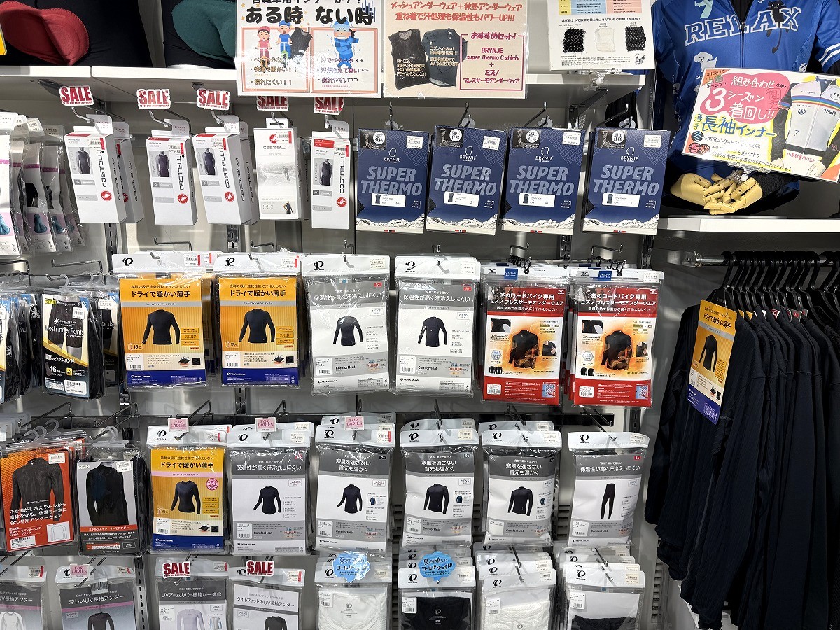 アンダーウェアコーナーでご案内中です!重ね着におすすめのBRYNJEメッシュアンダーはこちらにも大きく展示スペースをとっています。
