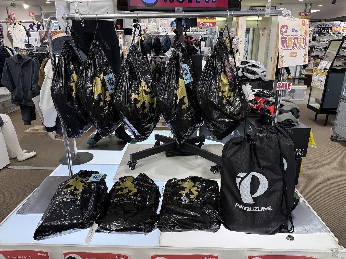 今なら新春初売り福袋が在庫あり!!冬物ウェア上下に+αでアイテムが入って¥22,000-(税込)と圧倒的にお買い得になっています!!冬物はジャケット1枚・タイツ1本でも2万円近くするものが多いので、この価格で上下が揃うだけでもかなり破格…!さらにいくつか小物も含まれているので、コストを抑えて冬物を揃えるならまずは福袋をGETしていただくのがおすすめですよ~!