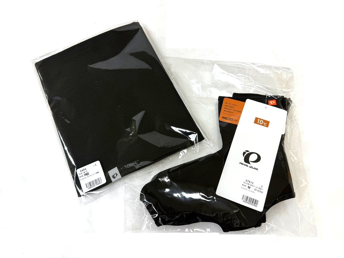 セットになっている小物は、首回りの防寒におすすめのネックウォーマーと、ガチガチに冷える足先の防寒に使えるシューズカバー。シューズカバーもタイツ同様に薄手の防風素材を採用しており、10℃帯表記ながらある程度の寒さに対応できるアイテムです!