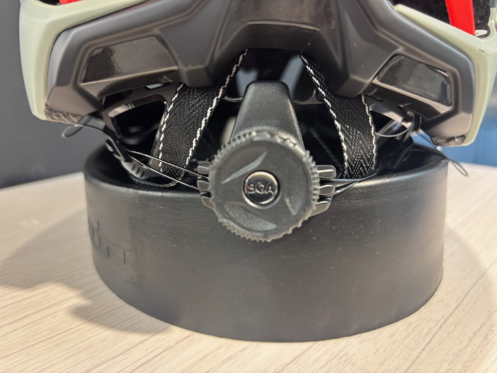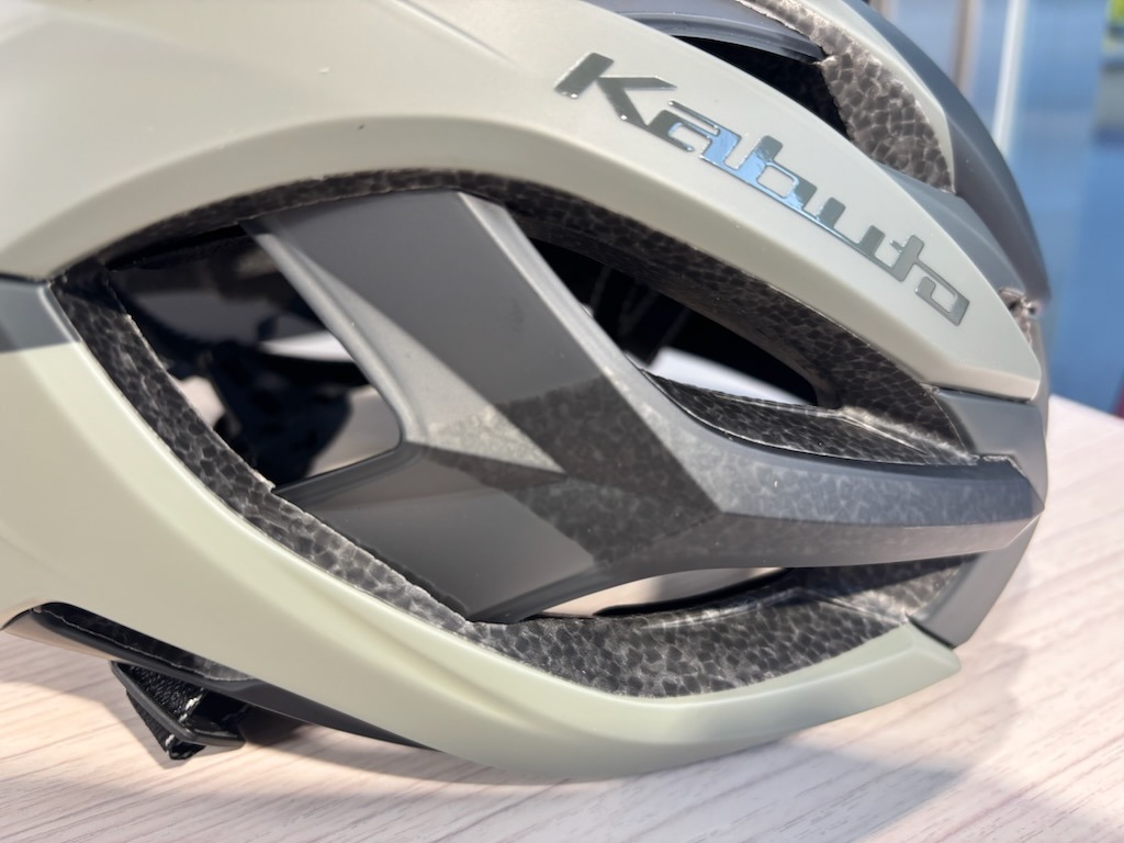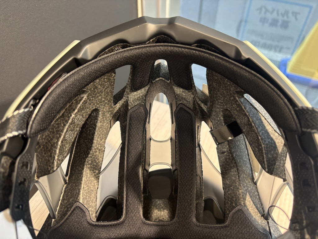 大きく開いたベンチレーションホールによってより効率の良い風の取り込みを可能にしていますがそれによるヘルメット自体の強度不足を補っているのがこのレインフォースブリッジ。これで補強することで風をしっかり取り込みつつヘルメット強度を確保しています。