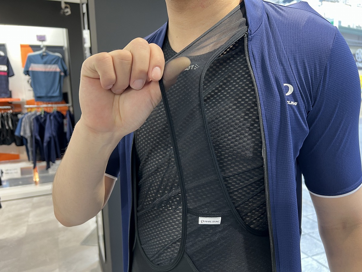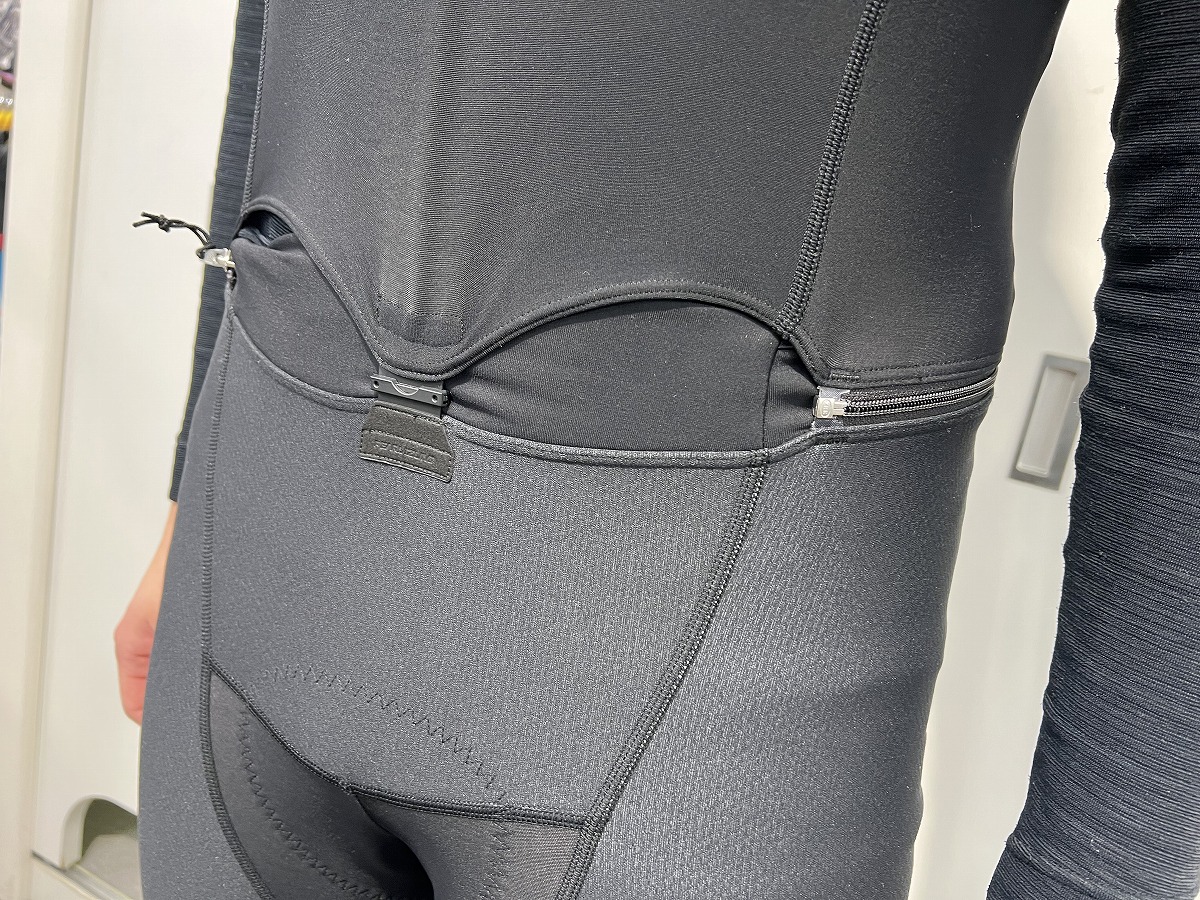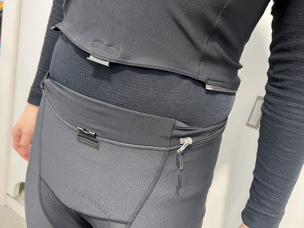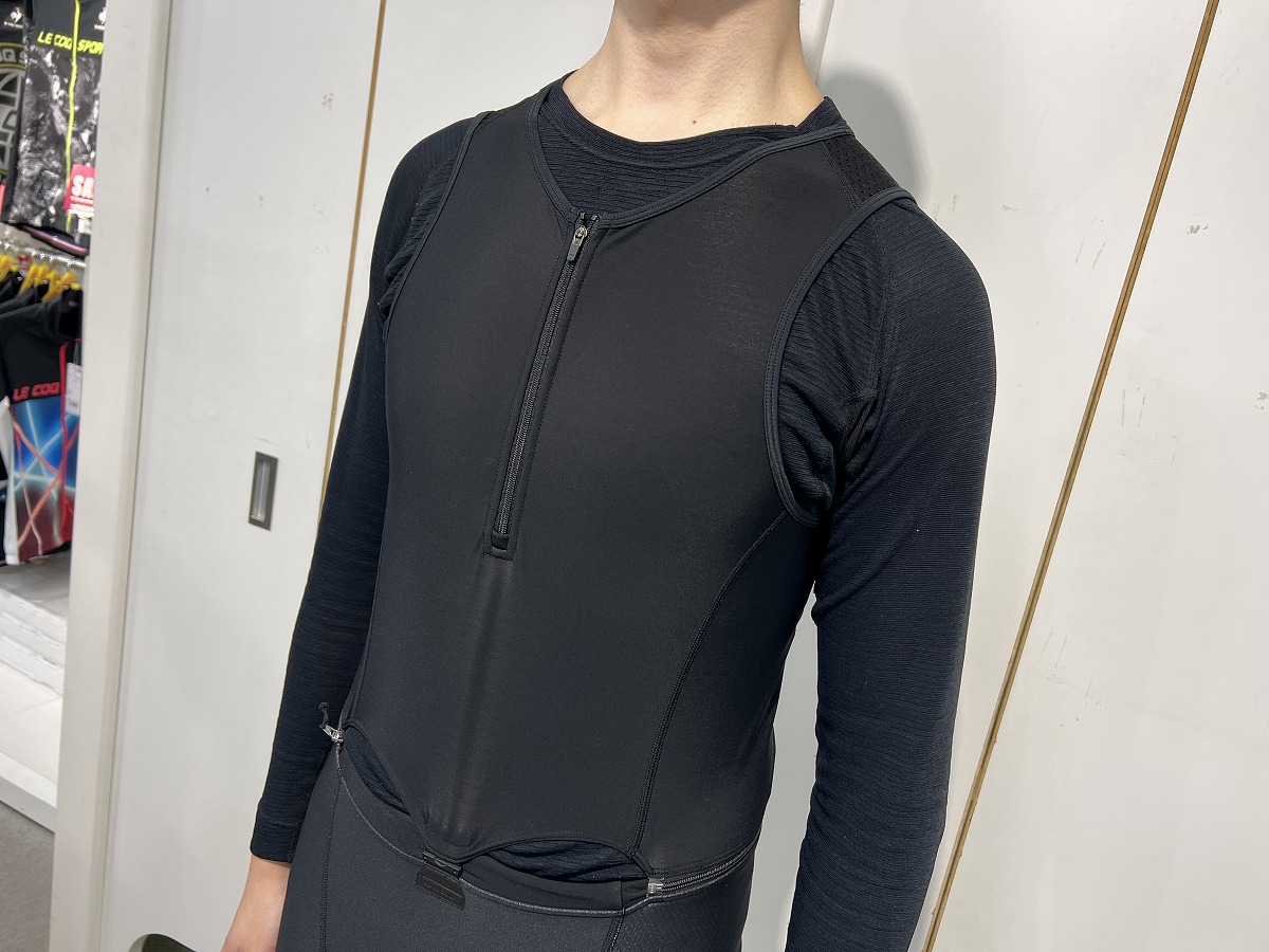 特に冬用のビブタイツは身体の前面の腹部~胸部にも生地があり暖かい仕様になっているものが多いので、風を受けて冷えやすい体幹部分も防寒できるのがポイント!