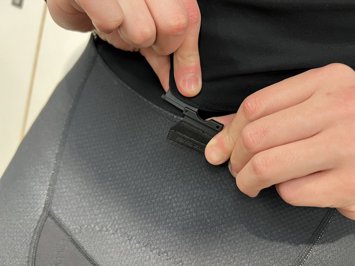 前傾姿勢をとった時に苦しくないよう、フックとファスナーはおなかの少し低めの位置に設定されています。また、着脱パーツの裏地には布があてられていて、隙間ができないように&パーツが身体に当たってストレスにならないように工夫されています。