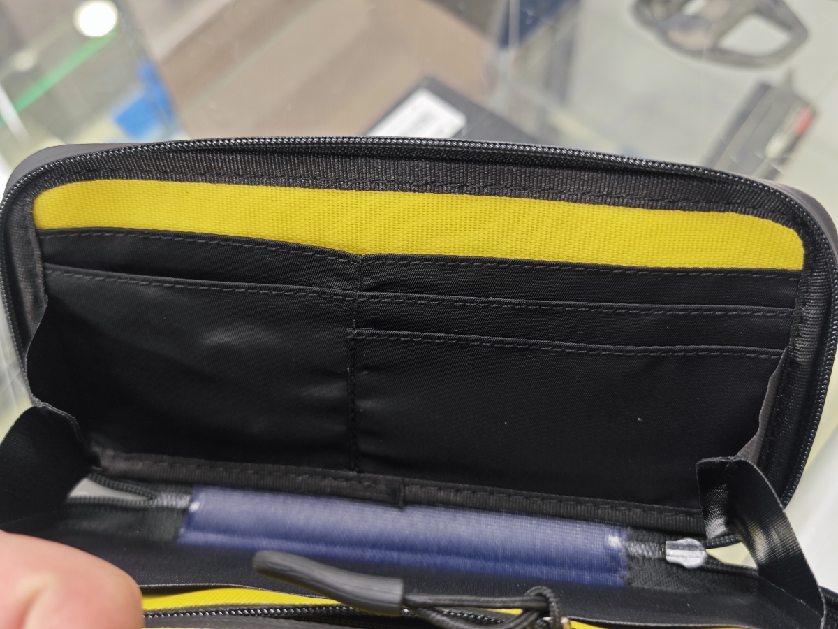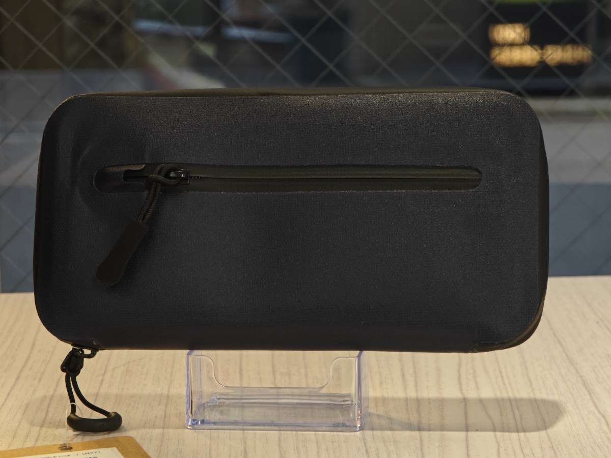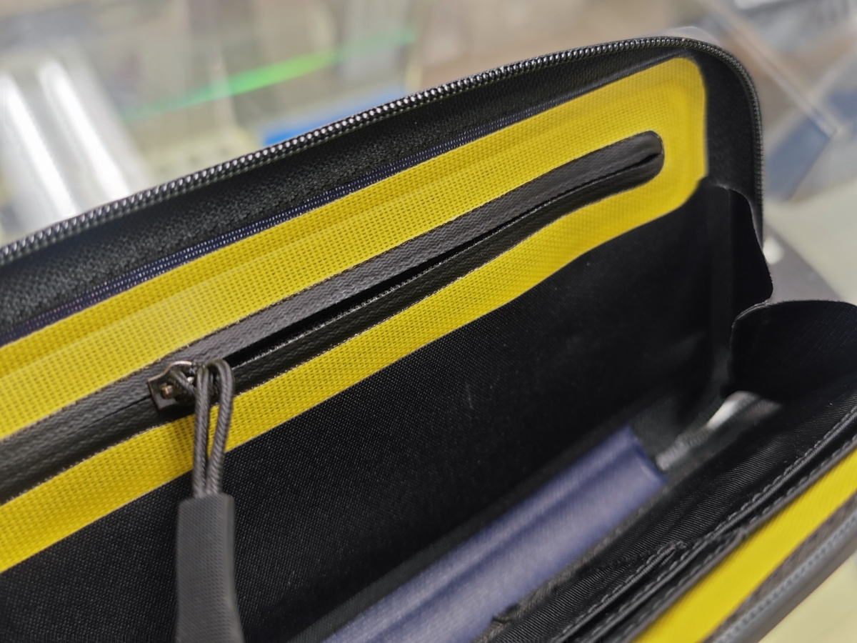 裏面には止水ジッパー、生地だけでなくジッパーまでも防水仕様ですよ、メインのジッパーを開けずに中の小銭入れにアクセスできるので自販機の利用時には便利ですね。