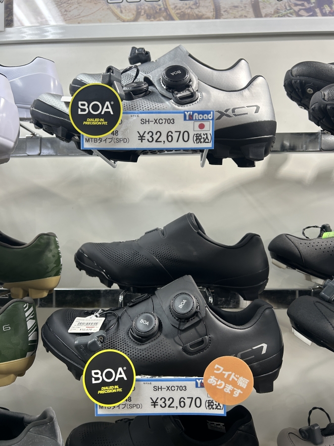 XC3グレードからBOAダイアル採用・WIDEサイズ有と必要十分な機能を有しているのですが、XC7グレードになると更にXC向けスパイク取り付け対応・ダブルBOAダイアル採用・剛性係数9のアウトソール採用など、より快適で本格的にサイクリングを楽しむことが出来ます。