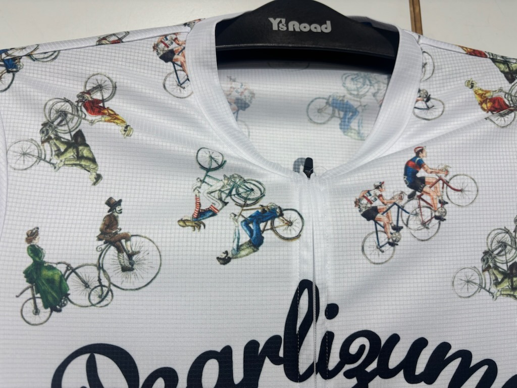 昔ながらの自転車に乗っている人たちがプリントされたかわいらしいデザインのジャージ