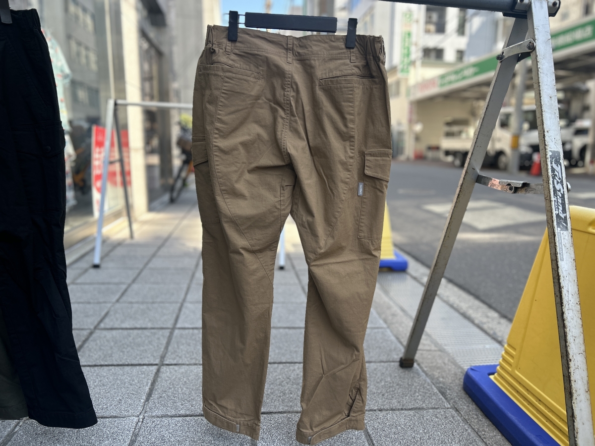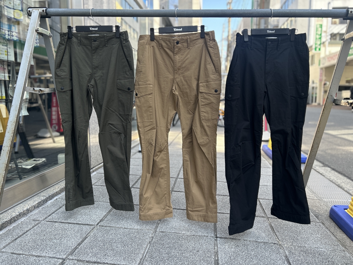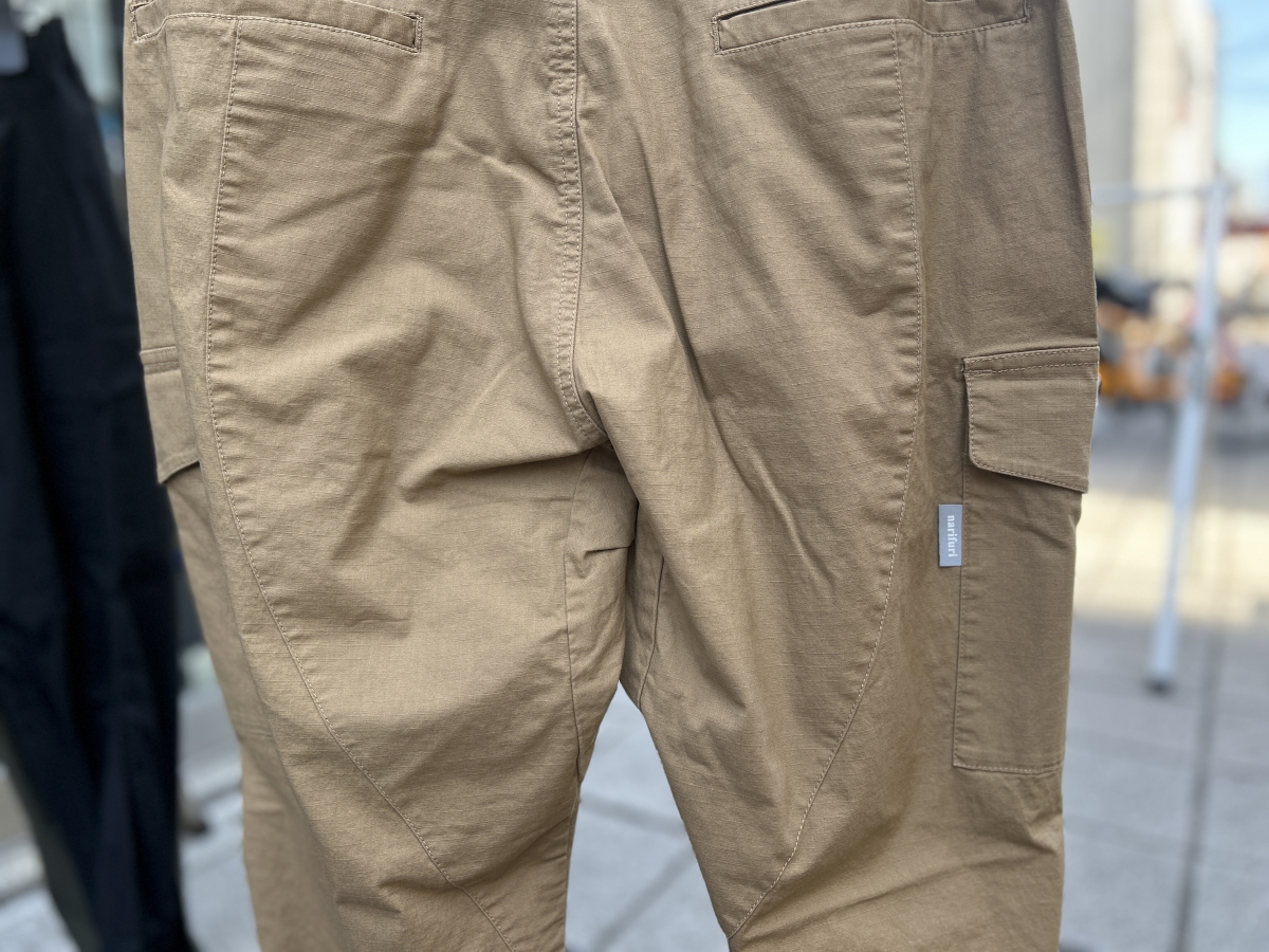 耐久性とストレッチ性を併せ持つnarifuri定番のカーゴパンツです。自転車にストレスなく跨れる構造とタフさ、ややワイドなセミテーパードシルエットが自慢です。