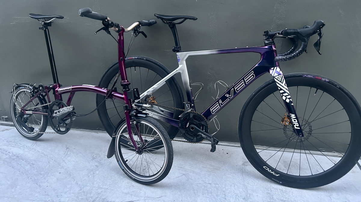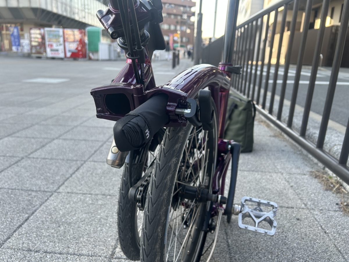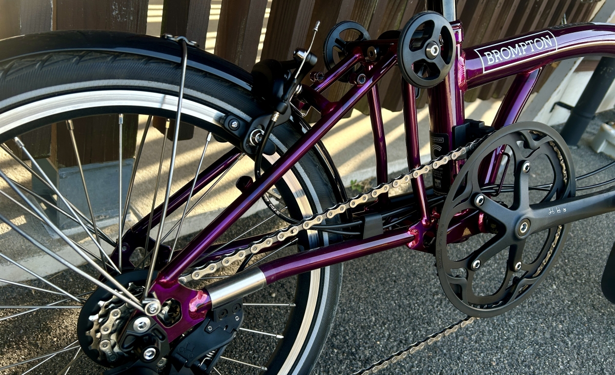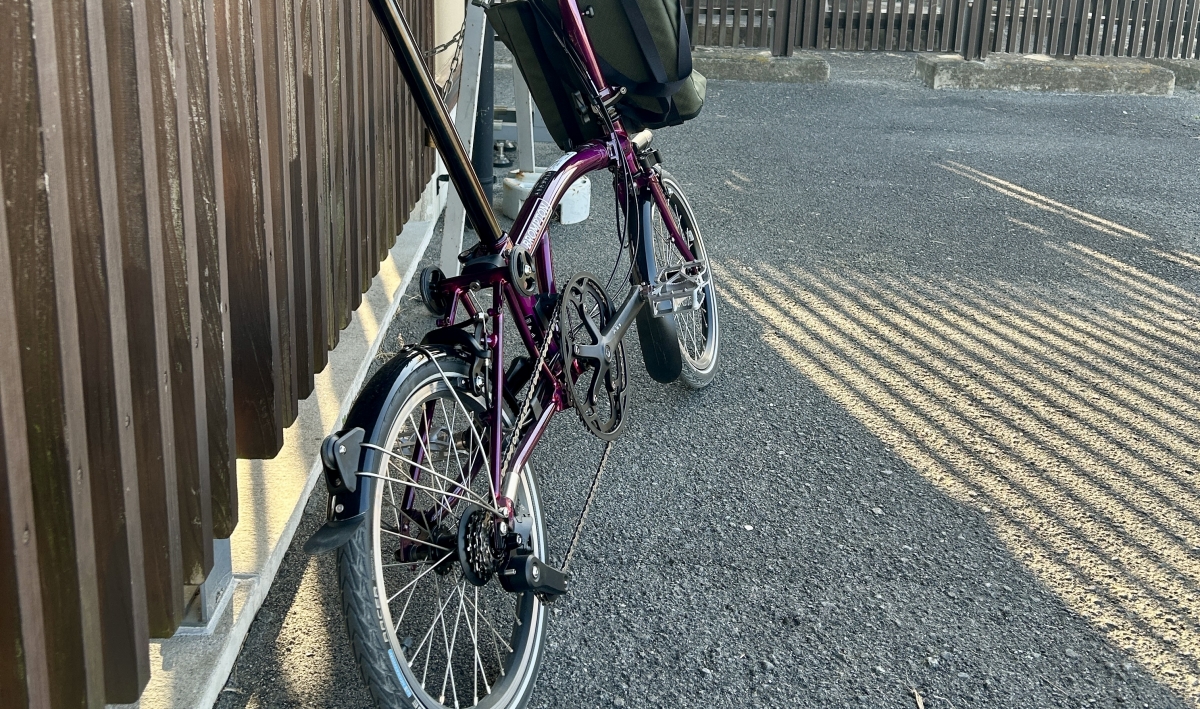 現在のメインのロードバイクが青紫系なので、赤紫系のブロンプトンと並べてイイ感じになるのも気に入ってます。