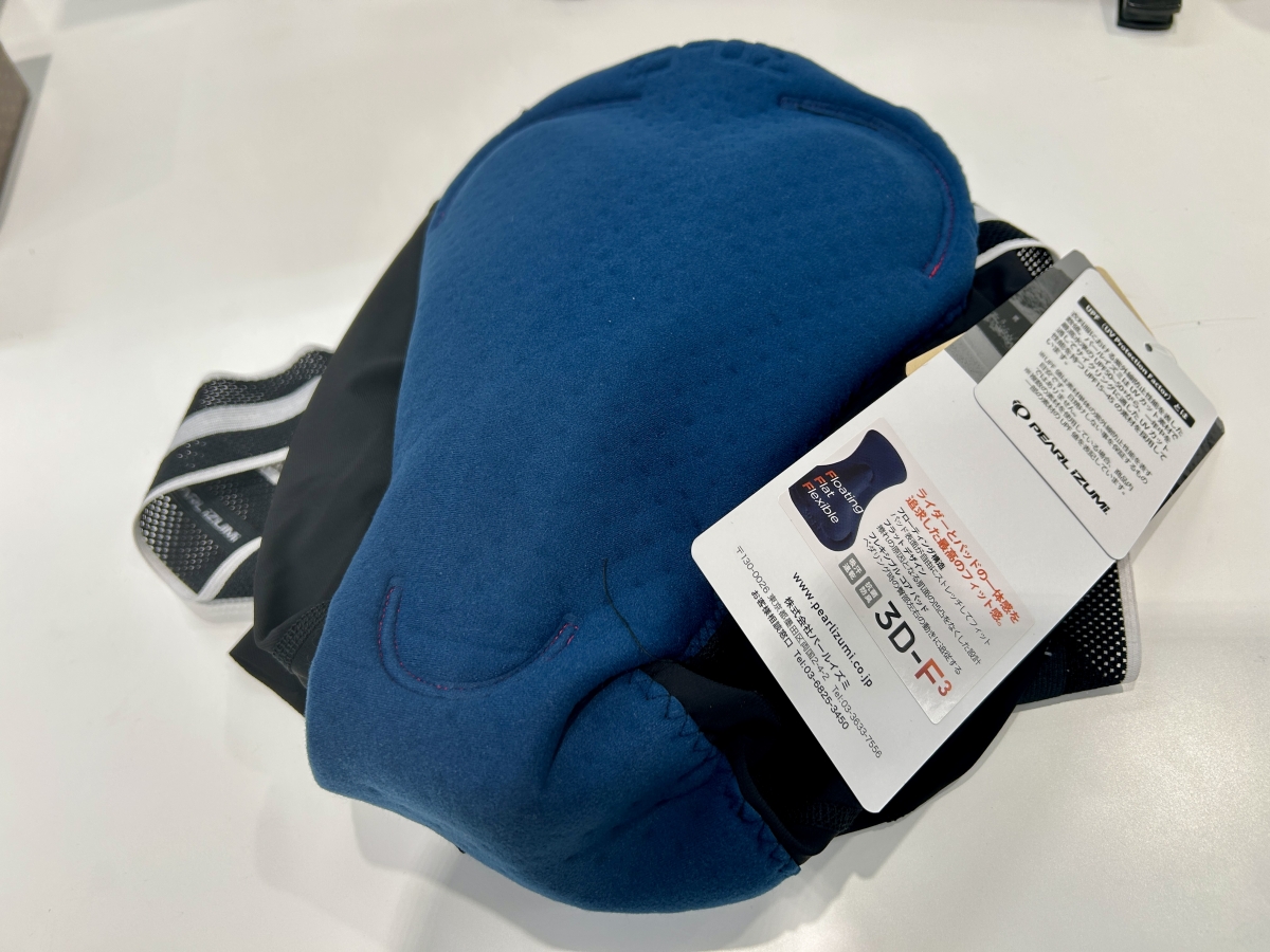 注目の3D-F3パッドですが厚すぎず反発も強すぎず、主張し過ぎない不思議な触り心地です。縫い目を極限まで減らしているのでこのような見た目になっています。この主張無く自然にフィットする感覚が、股擦れを気にせず高い強度でのペダリングに最適なのでしょう。