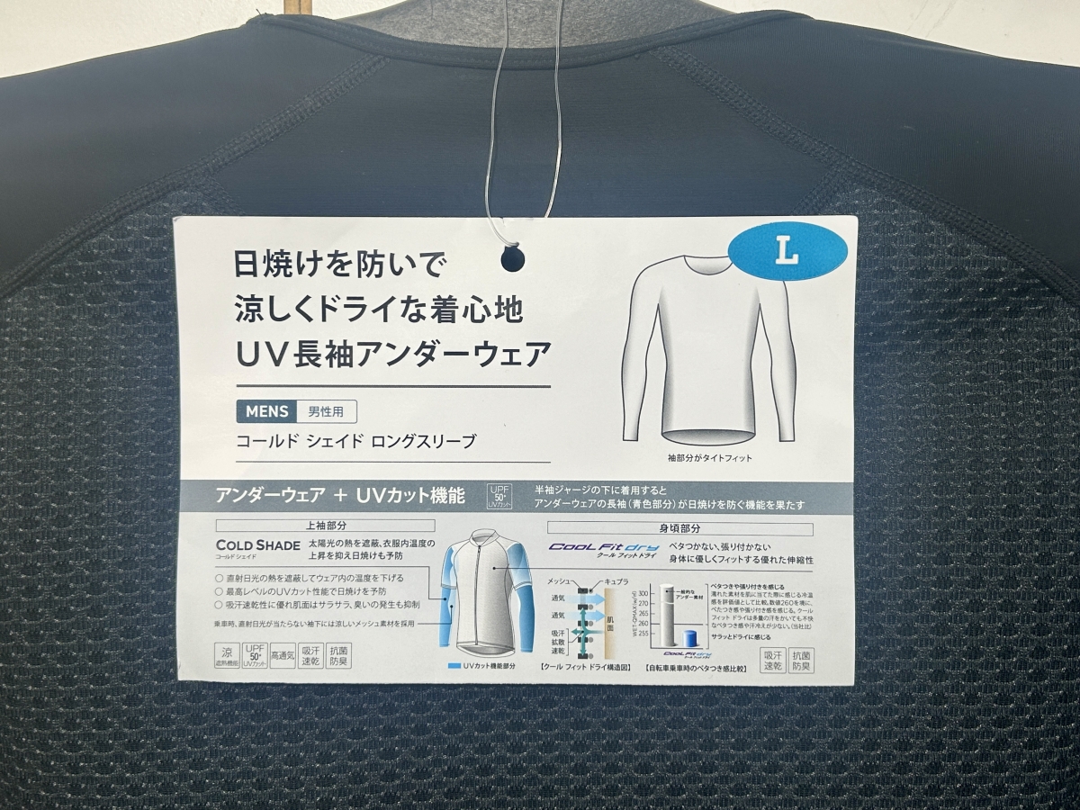 こちらのインナーですが体の部分はクールフィットドライ素材で、汗を即座にジャージに受け渡し体をサラサラに保ちます。アーム部分はコールドシェイド素材で、冷感と日焼け止め性能が高く、実質的に高性能インナーとアームカバーが一体となったインナーウェアです。