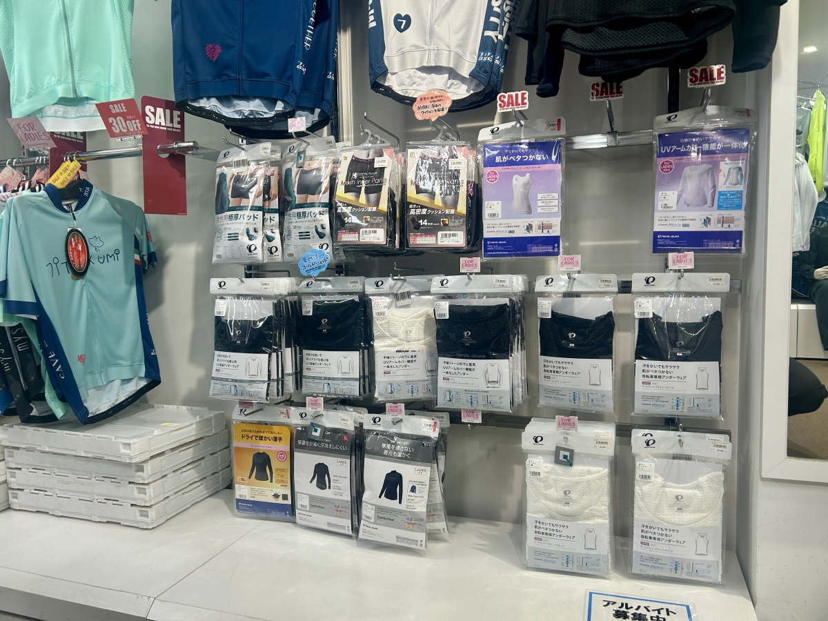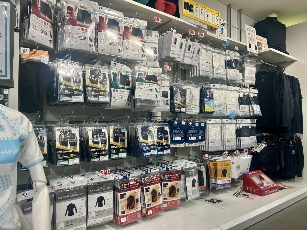初見時はインナーにこんな値段!?と驚かれる方も多いかと思いますが、きちんと値段なりの性能がございますしその旨説明いたします。その他、サイクルウェアについての悩みや疑問などございましたらどうぞ売り場の店員にご相談下さい。