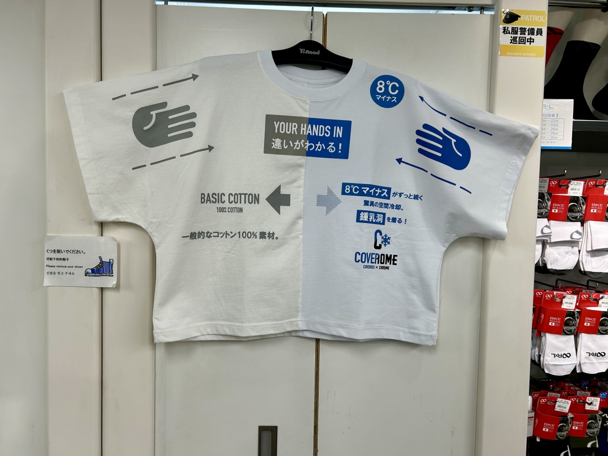 通常のコットン素材と8℃マイナス素材の比較サンプルもございますので、実際に触って着て違いを体感して頂けるかと思います。
