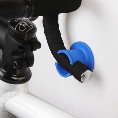 ハンドル等を押し込めばスタンド要らず自転車を自立できるという商品。