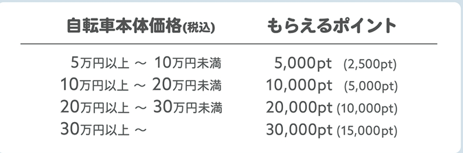 ※購入して頂いた車体の価格に応じてポイントをプレゼント致します、特価車の場合は半分のポイントになります。