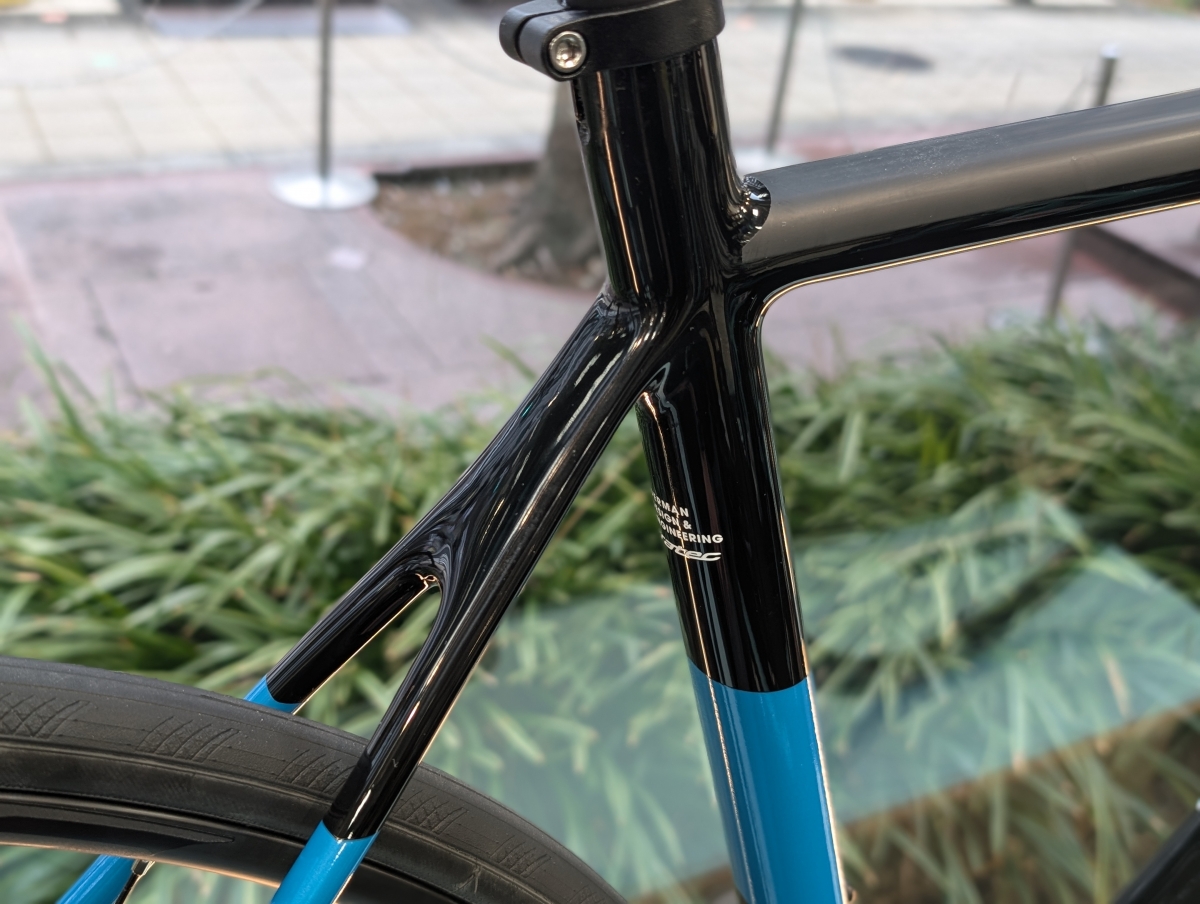 グロス加工の黒をベースに、ターコイズブルーが差し色に入っています。トップチューブの上面のみマットな黒になっていてデザインの上品さを引き立たせています!!