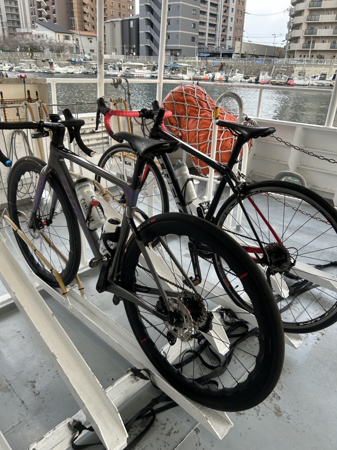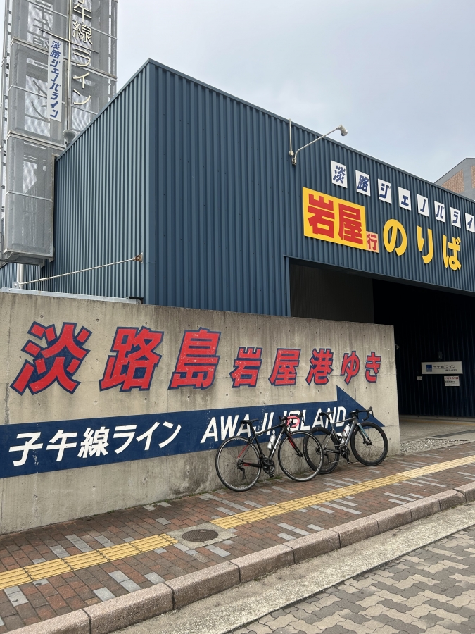 7時20分ぐらいに淡路島到着!輪行袋や着替えは岩屋フェリー切符売り場の建物の中にあるコインロッカーに預けます。(コインロッカーはそんなに数が多くなかったと思いますので注意!)ちょっと走ったところのコンビニで朝食をとってちょうど8時にスタート!!休憩は3回!洲本付近のファミリーマート、福良の道の駅で昼食(海鮮丼無茶うまかった~)、慶野松原付近のローソン!平坦は私が先頭で!登りは息子に抜かれて頂上で待ってもらう!!去年8月に獺祭ライド2024以来の長距離ライドに不安もありましたが無事15時30分頃に岩屋に到着です!!無事完走~~~~イェーイ!!!!!去年の夏から全くロードバイク乗っていませんでしたが若いころにロードを乗りまくっていたおかげなのかイイ感じで走ることができました!!