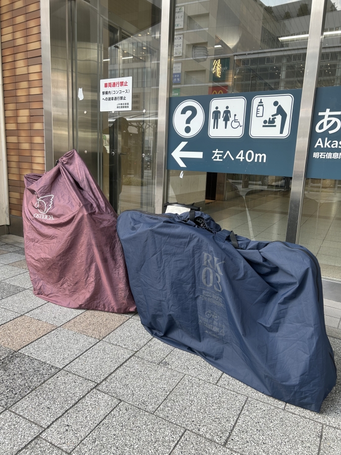 あまり迷惑をかけないようにと思い始発5時台の電車へ!一番早い電車でしたが思った以上に乗客が多く流石に2台並べて電車に乗せるのはとても気を使いました。朝一でも2台乗せるのであれば一番前か一番後ろの電車が良かったと後悔!普通列車 各駅停車でしたので約一時間10分ぐらいで明石駅到着!輪行袋から車体を組み立てます!